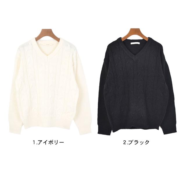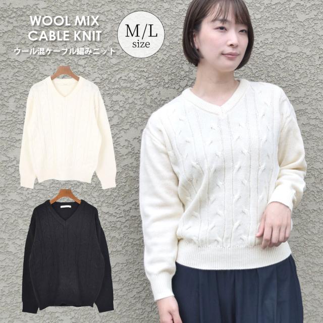 ニット レディース ケーブル編み 長袖 秋 冬 Vネック トップス セーター ウール混 ケーブルニット ざっくり きれいめ おしゃれ かわいい カジュアル オフィス シンプル 白 ホワイト 黒 ブラック ショート丈 fk25 (bdg519)