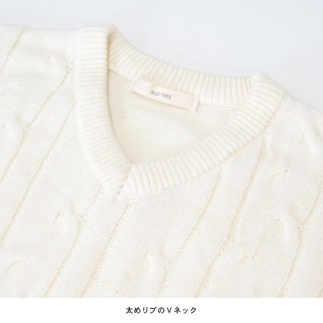 【ニット レディース ケーブル編み 長袖 秋 冬 Vネック トップス セーター ウール混 ケーブルニット ざっくり きれいめ おしゃれ かわいい カジュアル オフィス シンプル 白 ホワイト 黒 ブラック ショート丈 ボリューム 立体的】