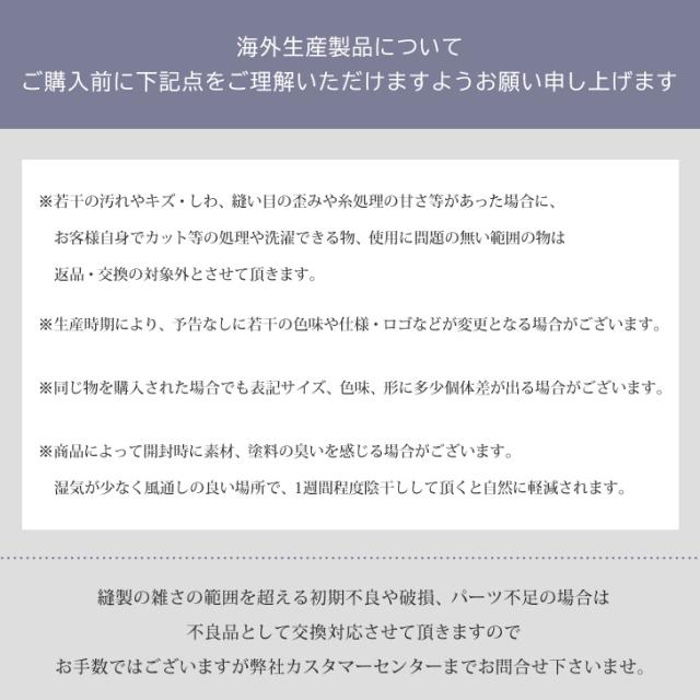 ■注意事項:商品の開封時に素材の臭いを感じる場合がございます。湿気が少なく風通しの良い場所で、一週間程度陰干しして頂くと自然に軽減されます。