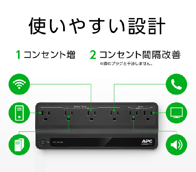 従来モデルよりもバックアップコンセントが増え、ACアダプタも接続できる、余裕をもったコンセントレイアウトにより、他プラグとの干渉せずに、より多くの機器の電源保護を接続可能にしました。