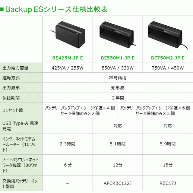 | APC 無停電電源装置 UPS BE425M-JP E常時商用給電 矩形波 家庭用 425VA/255W 2年保証 スペック情報 | |
