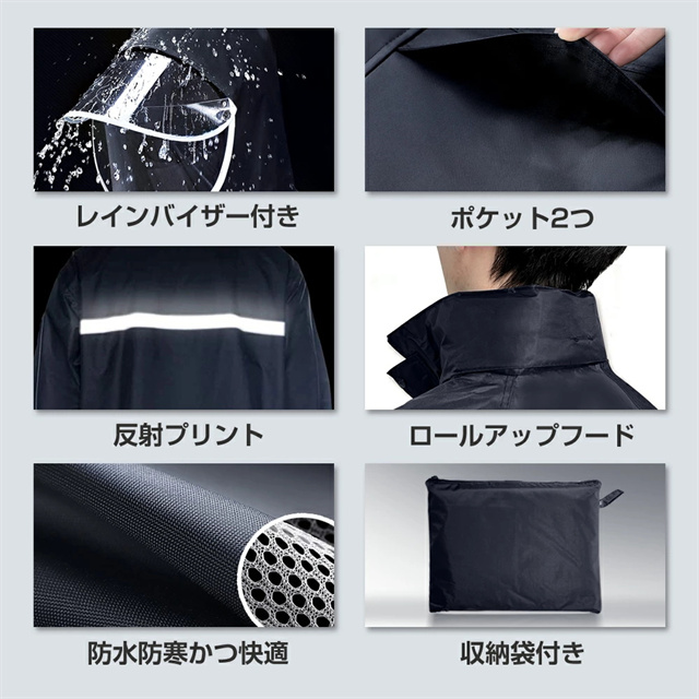 | 特徴 | 【男女兼用レインウェア】 ビジネスや通学などに使いやすいタイプで街歩きだけでなく、自転車、バイクなどにも対応可能なレインウェアです。 革新的な収納式フードと着脱式バイザートップによって、雨の日の自転車運転も驚くほど安全・快適。レインウェアは上下とも、裏地全体にメッシュ素材を使用しており蒸れやベタつきを防止します!日常の通勤・通学・お出かけになどにピッタリの、街で暮らすすべての人に安全・快適を提供する一着です。 【二重レインバイザー付き】 着脱可能なレインバイザー付き、レインコートのフードにつけると、透明の二重つばができて顔を覆ってくれて、クリアな視界を確保できながら、風・雨・雪・飛沫などから顔を濡らさずに守ります。フードはロープで調節可能で、自転車運転などの時にも雨水の浸入を防ぐことができます。収納袋付き、旅行、出張、アウトドアにも楽々持ち運べて、自宅/事務室/車の中に常備すれば、急な雨にも心配はありません。 【撥水・防水・耐久性高め】 耐久性に優れたEVAエコ素材を採用し、耐水圧10,000mm、防水力高め、丈夫で破れにくいレインウェアです。多重撥水加工を施され、水が生地の中に染み込むことなく弾けます。ファスナー+ボタンの二重設計により、ファスナーを閉じてボタンを留めることで雨水や風の侵入を防げ、大雨でも安心なレインコートです。 【反射帯・ポケット付き】 反射テープがあり、夜道や雨で視界が悪い時でも安心安全にご利用いただけます。ジャケット両サイドには大容量のフラップ付きポケットを配置し、利便性も確保しています。 【収納可能なフード】 着たままでフードを丸めてワイドカバーで固定です。バタつき2WAYフードはシーンによって使い分けができます。大きめのフードが頭をしっかりと覆い、顔周りに雫が落ちるのを防ぎます。 |