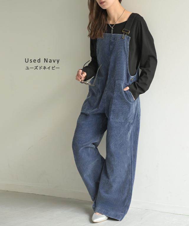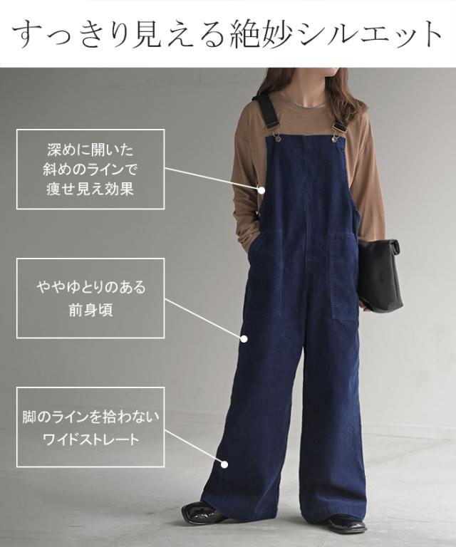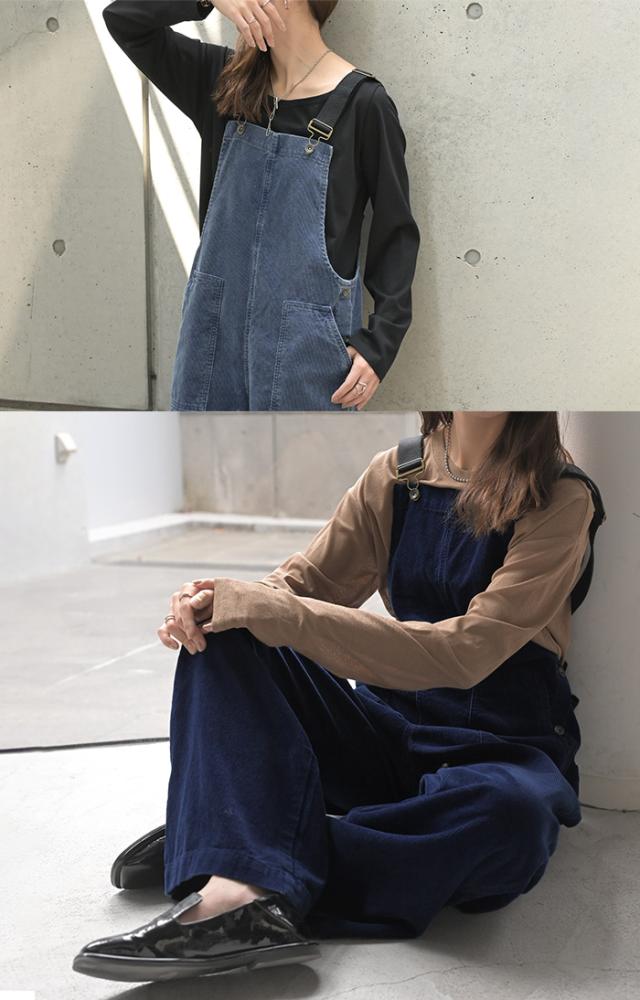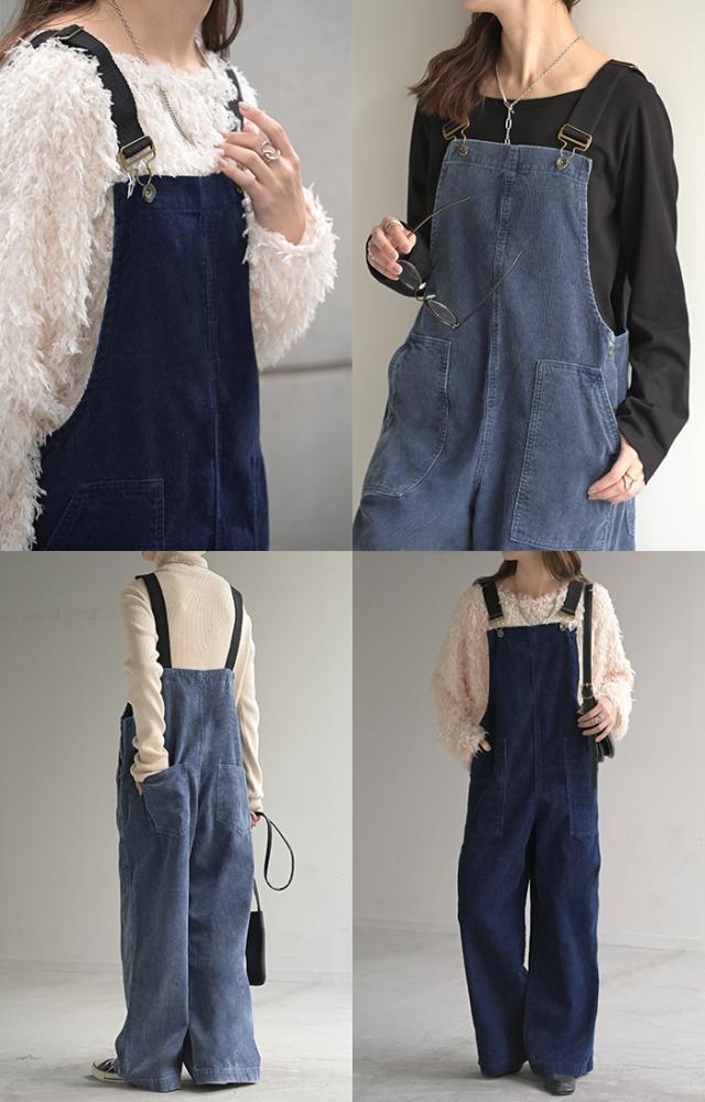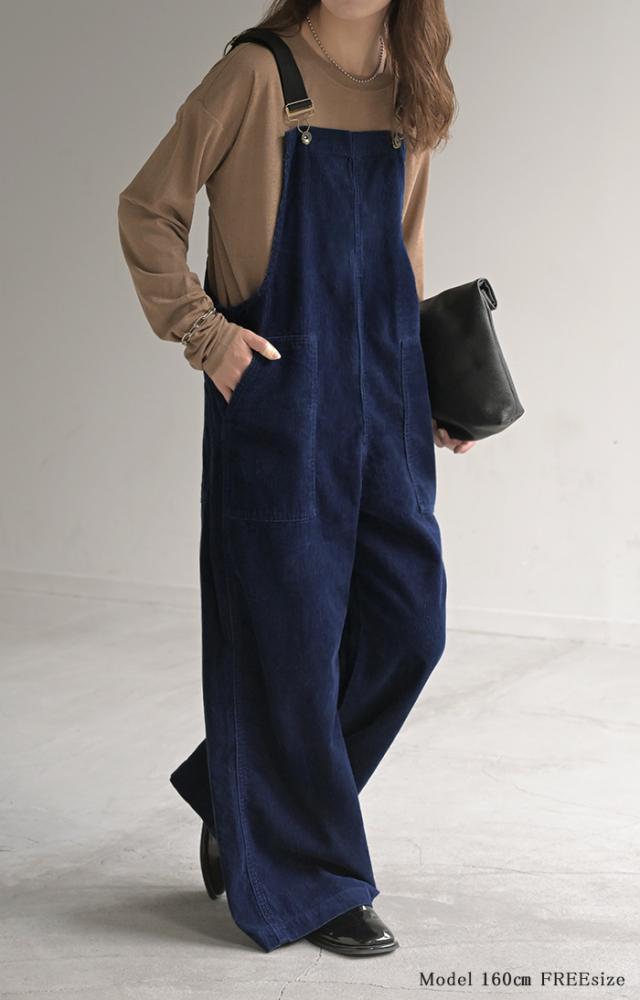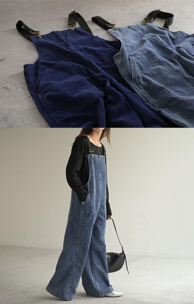2025AW新作 サロペット 綿100 コーデュロイ ロング レディース サロペ パンツ ロングパンツ ノースリーブ ワイド ストレート オーバーオール レイヤード 重ね着 調節可能 ゆったり きれいめ オーバーサイズ 大きいサイズ 体型カバー ブルー ネイビー 秋 冬 HUG.U
