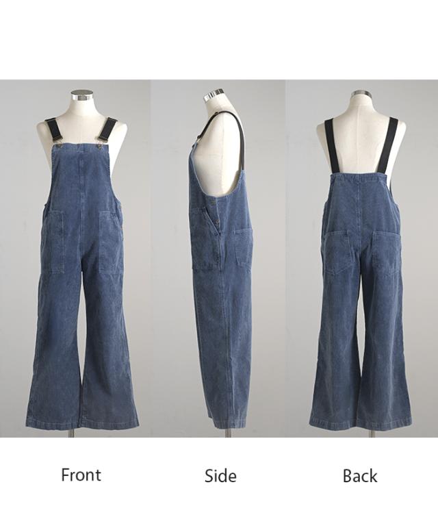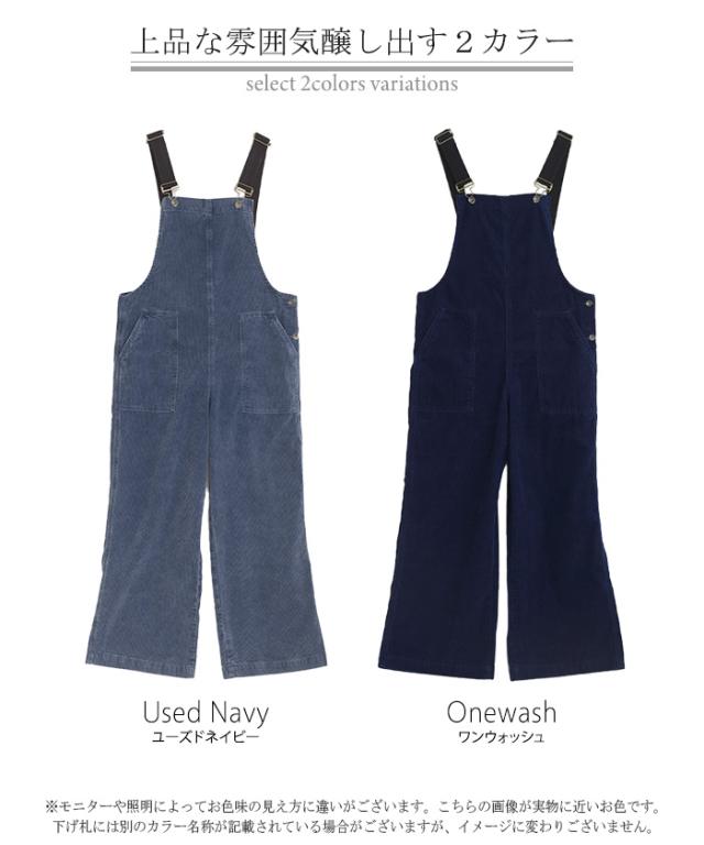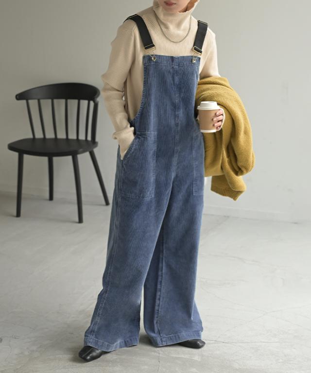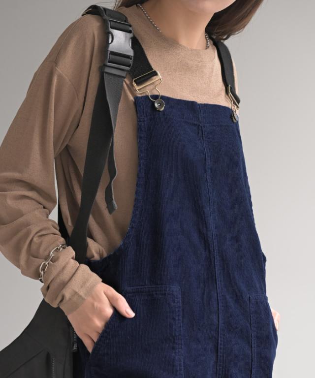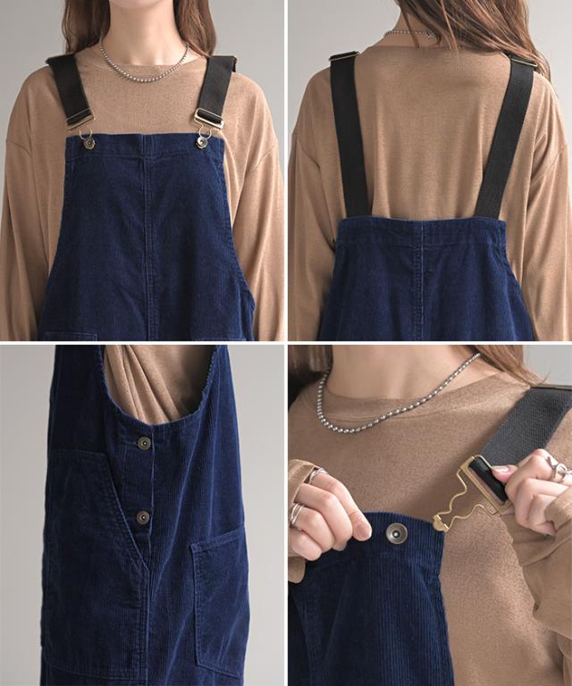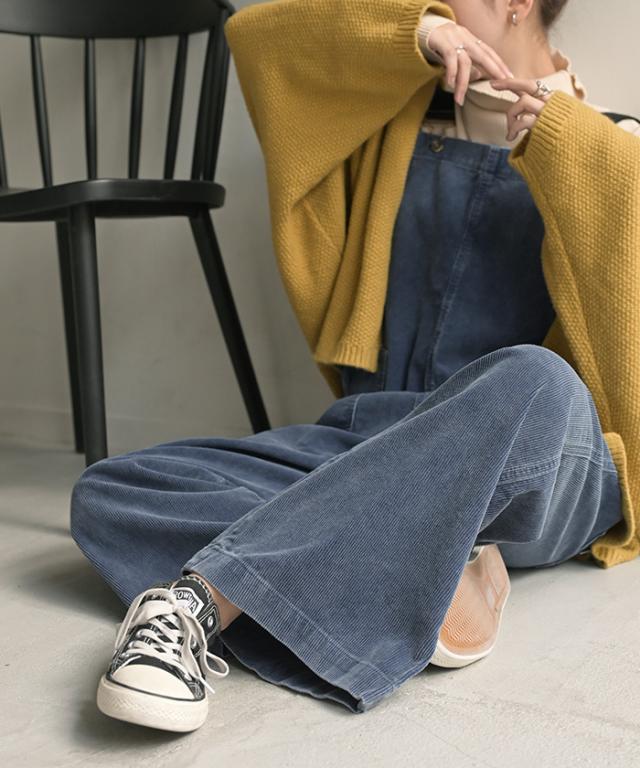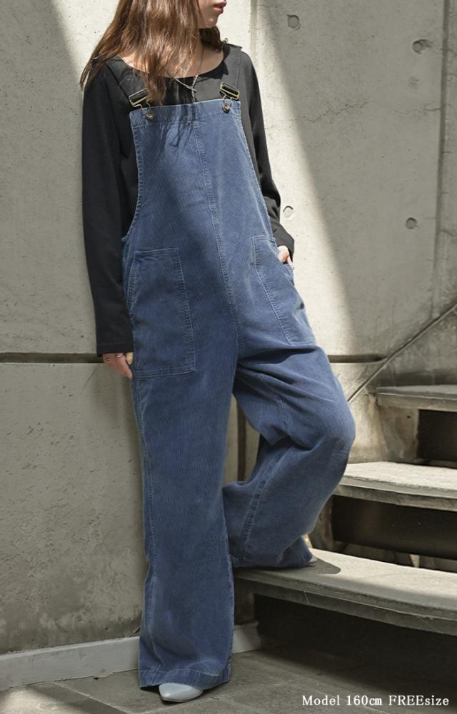 2025AW新作 サロペット 綿100 コーデュロイ ロング レディース サロペ パンツ ロングパンツ ノースリーブ ワイド ストレート オーバーオール レイヤード 重ね着 調節可能 ゆったり きれいめ オーバーサイズ 大きいサイズ 体型カバー ブルー ネイビー 秋 冬 HUG.U