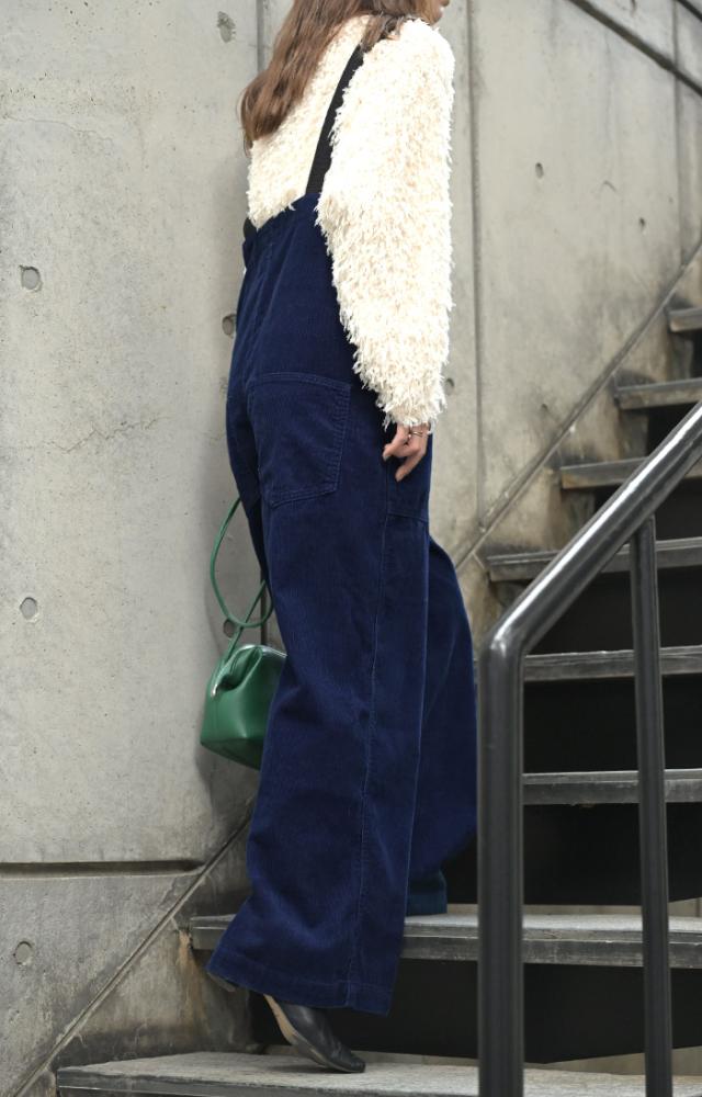 コーデュロイの生地をインティゴ染めしたサロペットパンツです。