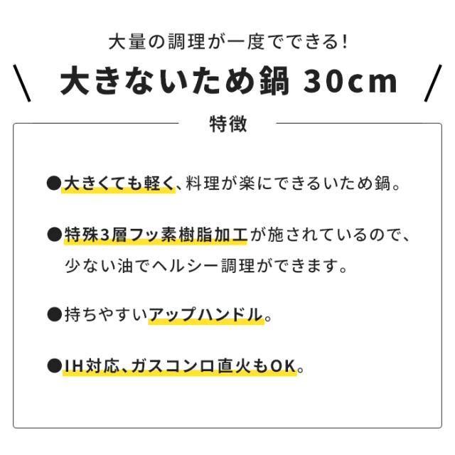 大きな炒め鍋 30cm ih対応 いため鍋 30センチ IH対応 フッ素コート ガス火対応 ビッグ 大きい フライパン 中華鍋 深型 ふっ素加工 フッ素加工 軽い 軽量 大家族 大量 5人家族 ファミリー 新生活 調理器具