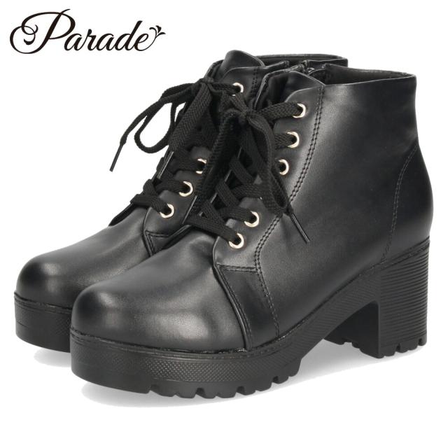 レディース ブーツ 黒 レースアップ 厚底 ファスナー付き ショートブーツ 靴 ブラック 7826 Parade