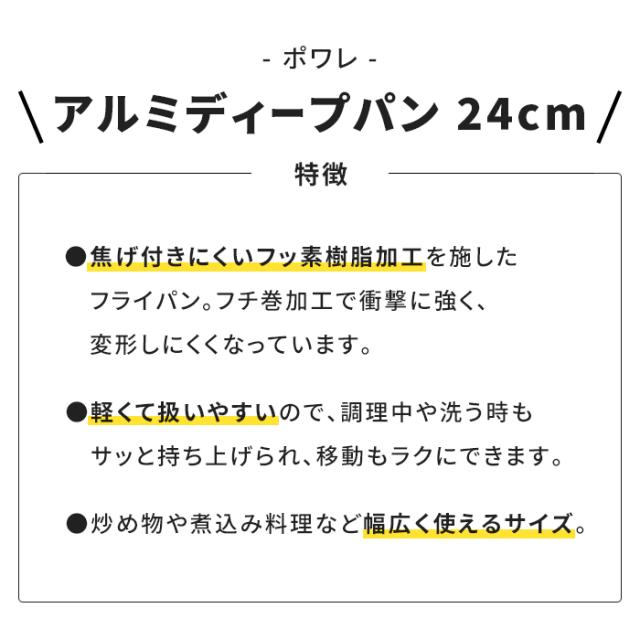 | 【ポワレ】 ● フライパン20cm ● ディープパン24cm ● フライパン26cm ● いため鍋28cm ● 玉子焼13×18cm ※このページは[ポワレ ディープパン24cm]を販売しております。 |