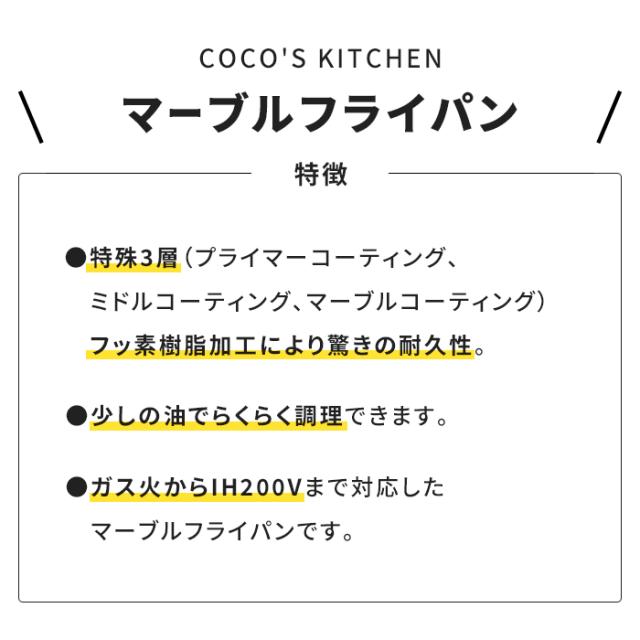 | 3層特殊マーブルコーティングのフライパン。 特殊3層(プライマーコーティング、ミドルコーティング、マーブルコーティング)フッ素樹脂加工により驚きの耐久性。 少しの油でらくらく調理できます。 ガス火からIH200V対応まであらゆる熱源に対応。 持ちやすいアップハンドルです。 |