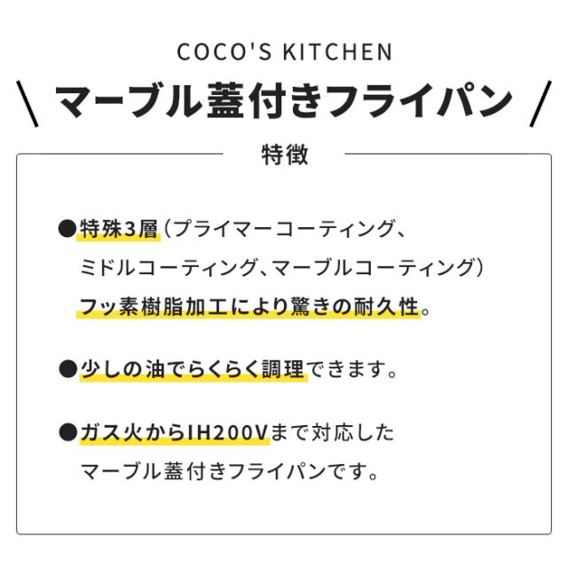 | 【COCO'S KITCHEN ◆ IH対応】 ● マーブルフライパン20cm ● マーブルディープパン24cm ● マーブルフライパン26cm ● マーブルフライパン28cm ● マーブルいため鍋28cm ● マーブル玉子焼13×18cm ● マーブル片手鍋18cm ● マーブル両手鍋20cm ● マーブル蓋付フライパン26cm ● マーブル寸胴鍋22cm ※このページは[COCO'S KITCHEN ◆ IH対応 マーブル蓋付フライパン26cm]を販売しております。 |