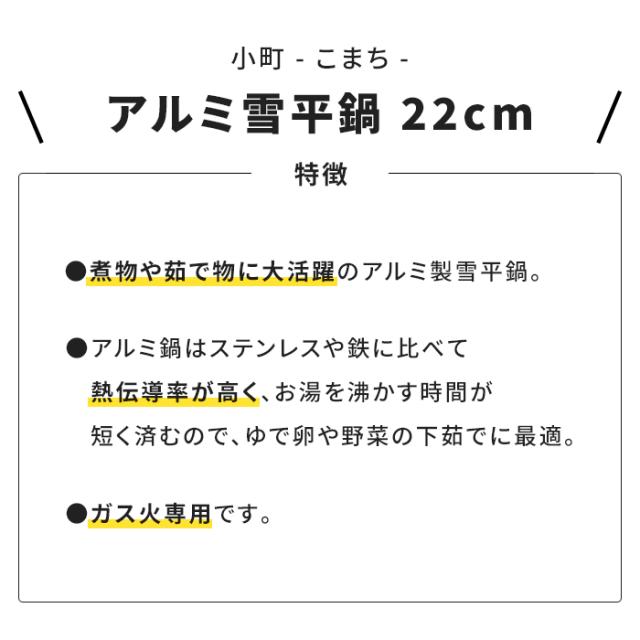| 煮物や茹で物に大活躍のアルミ製雪平鍋。 アルミ鍋はステンレスや鉄に比べて熱伝導率が高く、お湯を沸かす時間が短く済むので、ゆで卵や野菜の下茹でに最適。 ガス火専用。 |