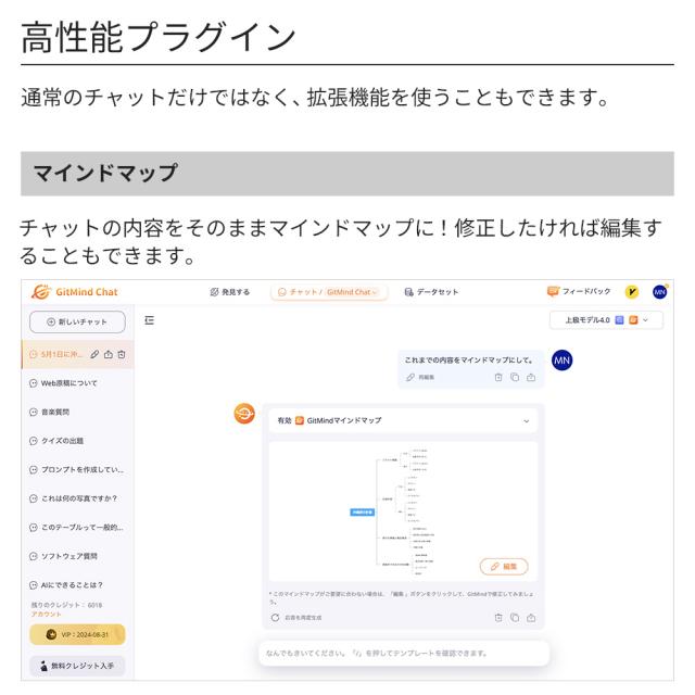 | ライセンス | GitMind Chat プロ 1年版 利用可能期間:1年(12ヶ月) 利用可能人数:1名 永久クレジット:5,000 月間クレジット:2,000/月(12回配布・最大24,000) GitMind Chat プロ 1年版 チーム 5ユーザーパック 利用可能期間:1年(12ヶ月) 利用可能人数;5名(追加可能) 永久クレジット:15,000 月間クレジット:10,000/月(12回配布・最大120,000) 1ユーザー追加につき永久クレジット+3,000、月間クレジット+2,000/月 |