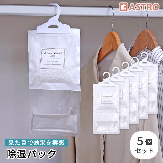 除湿パック 5個組 【 クローゼット 除湿剤 】 吊り下げ 約500ml 吸湿 効果や残量が見て分かる 衣類 乾燥材 湿気対策 吸湿パック 強力 湿気取り 防カビ 防臭 押入れ リビング 寝室 玄関 インテリア 大容量 アストロ 730-75