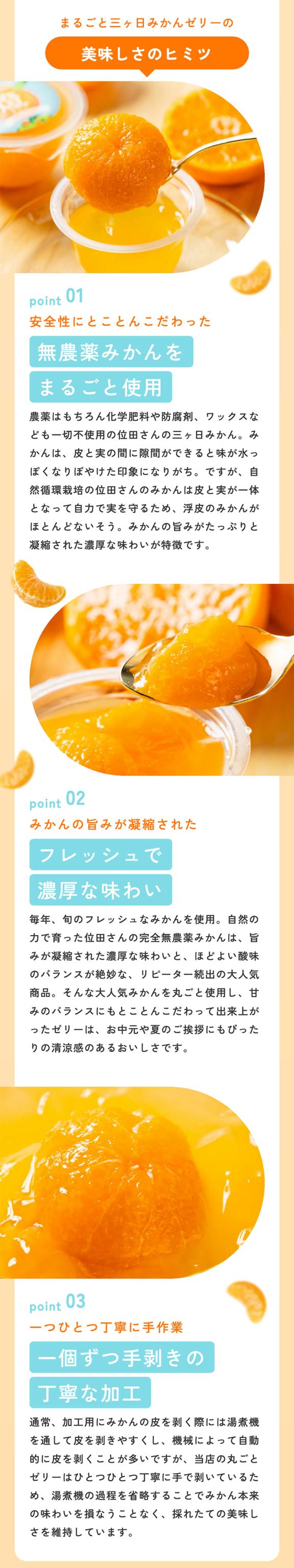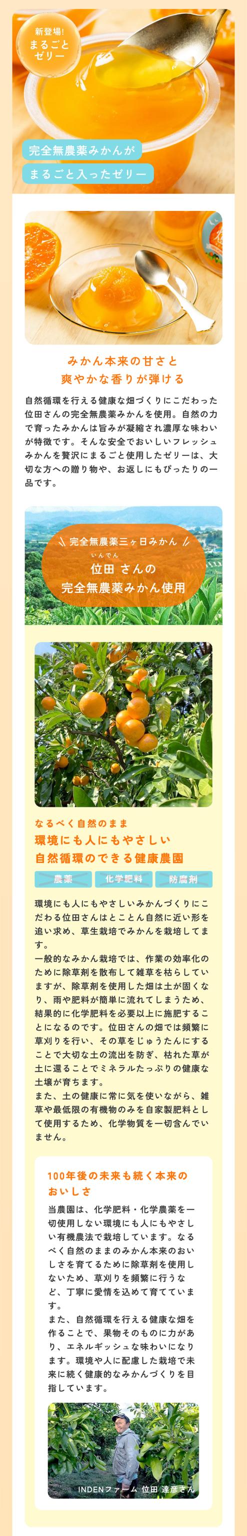 まるごとみかんゼリーは位田さんの完全無農薬みかんを贅沢に使用した旨みが凝縮された濃厚な味わいをお楽しみいただけます。