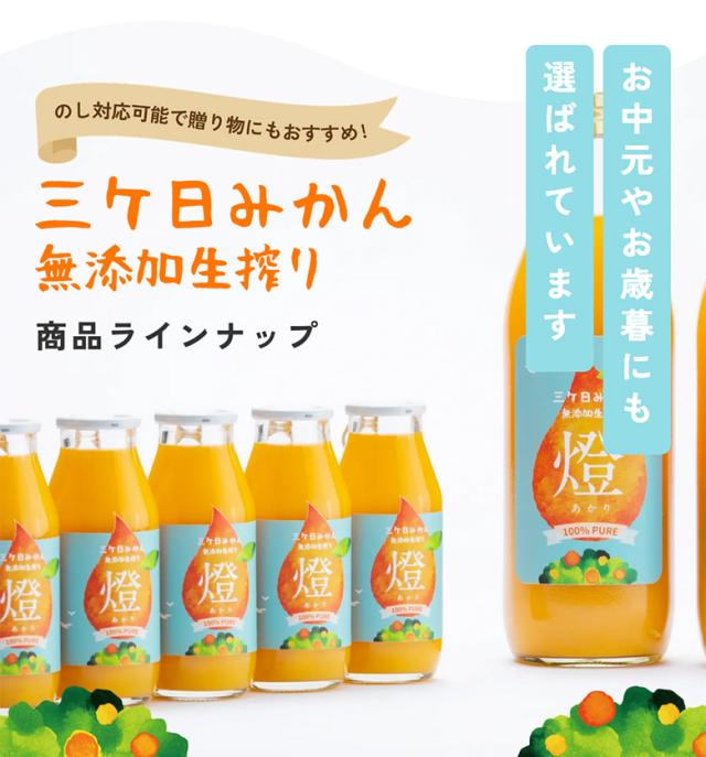 三ヶ日みかんジュースは、濃厚な甘さとほどよい酸味のバランスが絶妙な三ヶ日みかん青島をそのまま生搾りした100%無添加ジュースです。