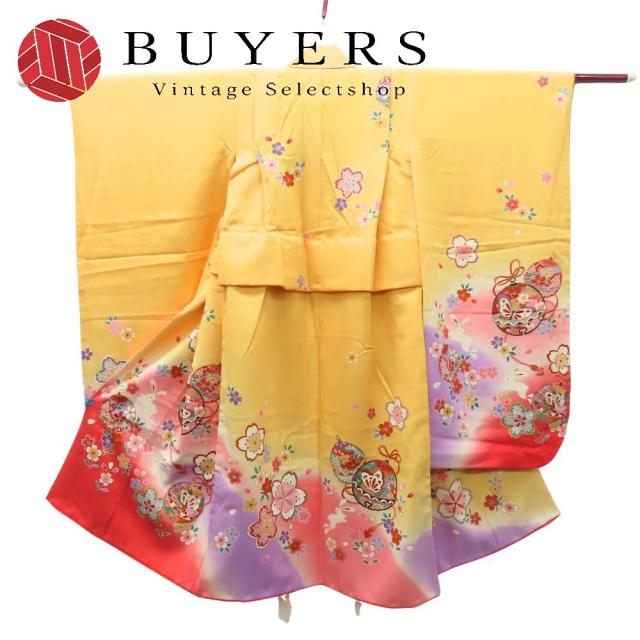 | 品名 | 中古 子供着物 祝い着 肩揚げ・腰上げ済 正絹 山吹色 ピンク系 3歳用 七五三 お宮参り |
