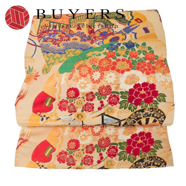 中古 袋帯 正絹(金銀糸除く) ベージュ ゴールド 御所車柄 風景柄 丸帯 和装 呉服 和服 きもの レディース 女性