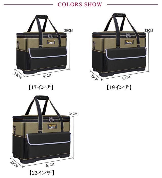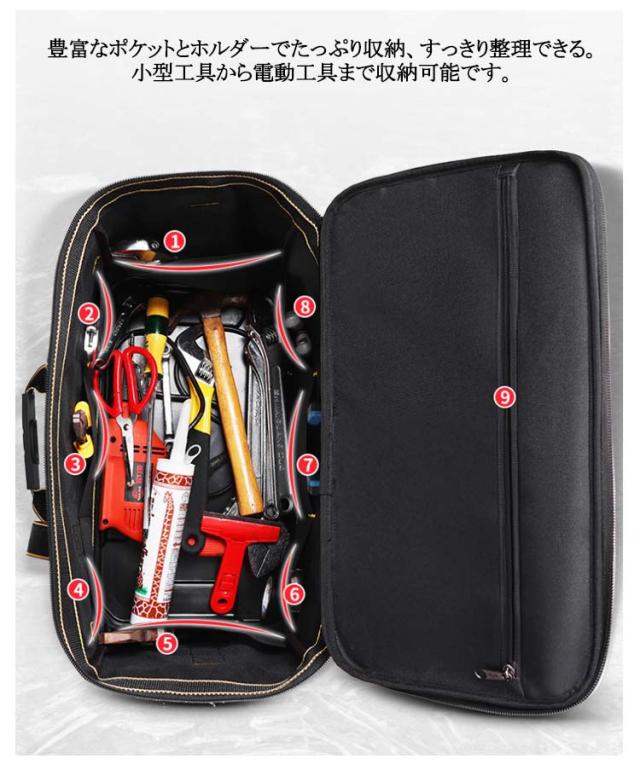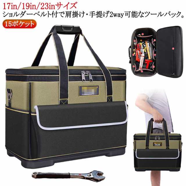 | ショルダーベルト付で肩掛け・手提げ2way可能なツールバック。【15ポケット】【17in/19in/23inサイズ】 特徴:道具工具の収納・持ち運び。探しやすく、取り出しやすい 豊富なポケットとホルダーでたっぷり収納、すっきり整理できる。小型工具から電動工具まで収納可能です。 6000D高密度オックスフォードを採用しています。強化縫製でしっかりと仕上げられ、耐荷重、耐摩擦、耐久性に優れてます。 工具入れバッグは様々な道具や工具の収納、携帯に、仕切りがついており大変便利です。ガーデニング、釣り、工芸、建築、大工、請負業者、屋根、ラインマン、石工、鉄工などの作業を携わる人に最適にします。日常生活のDIY活動だけでなく、自動車修理、木工および専門な修理活動も最適です。 | |