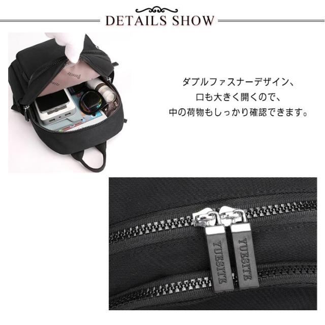 | 軽くてたっぷり収納できるミニリュック 大きすぎず小さすぎず使いやすいサイズのリュックサックです。 どんなコーデにも合わせやすいシンプルなデザイン。 お財布や水筒、傘等必要な物を入れて、気軽に持てるサイズはどんなお出かけにもベストマッチ! 汚れにくいナイロン素材で、撥水機能があり、雨の日にも重宝します。 ダブルファスナーデザイン、口も大きく開くので、中の荷物もしっかり確認できます。 普段お出掛け、ハイキング、旅行など様々な室外活動をする時に便利な使い勝手の良い、多機能リュックサックなので、1枚だけで楽々お出掛けできる。 | |
