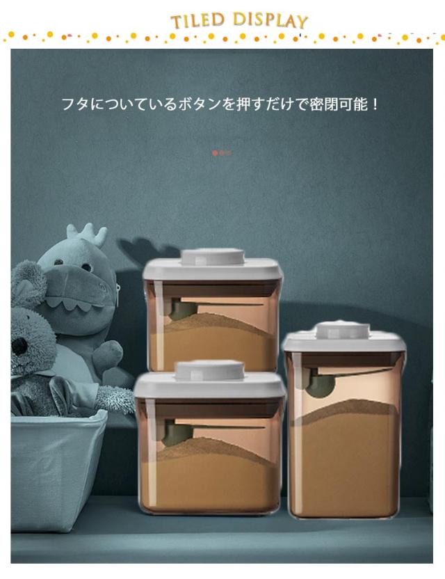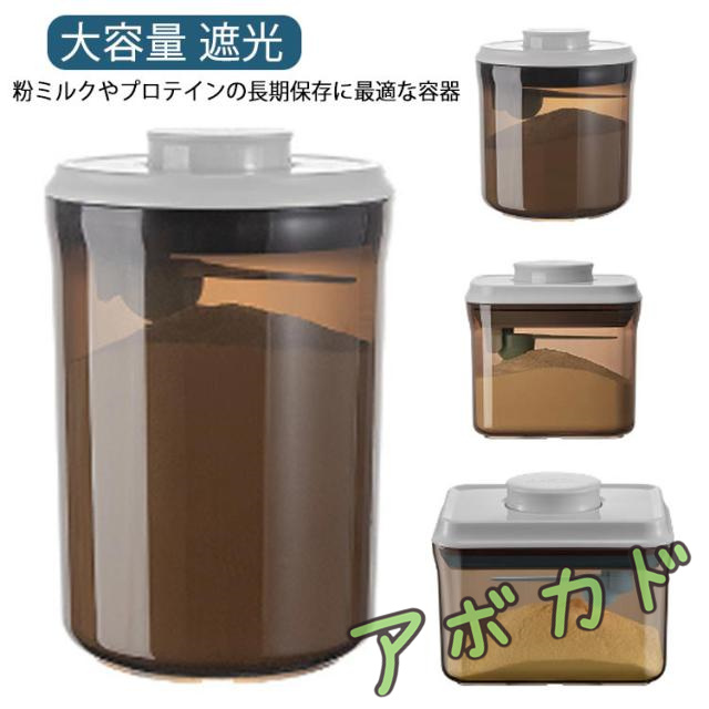 | 茶色遮光デザイン!粉ミルクやプロテインの長期保存に最適な容器 フタについているボタンを押すだけで密閉可能!片手でワンタッチなので、料理中の手がふさがっている状況でも使いやすいのがうれしいポイント。 フタ部分はスプーン収納所があり、サイズ違いスプーンにも対応できます。 コンパクトなサイズ、外遊びや旅行に大変便利なアイテムです。 粉ミルクだけでなく、米やナッツなどの保存容器としてもおすすめ。 | |