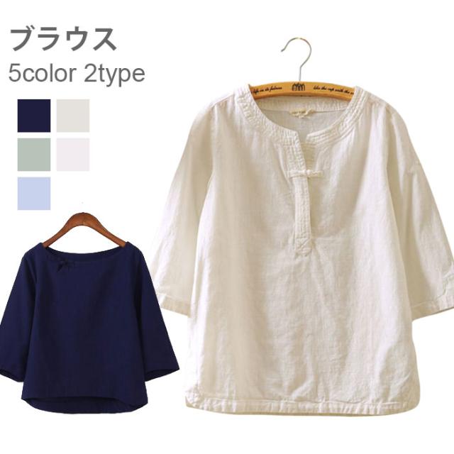 リネンシャツ レディース ブラウス 無地 リネンタッチ 綿麻 七分袖 トップス おしゃれ ブルー ホワイト グリーン ネイビー 可愛い オフィス カジュアル チャイナ風 ファッション 涼しい