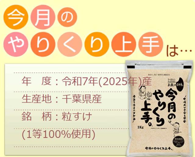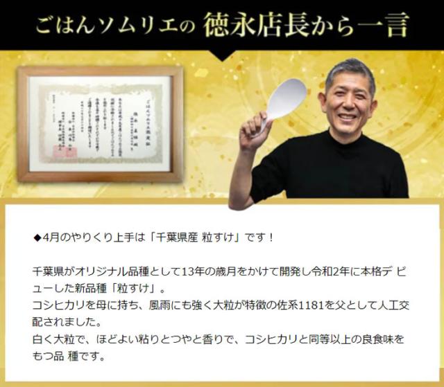 ◆4月のやりくり上手は「千葉県産 粒すけ」です! 千葉県がオリジナル品種として13年の歳月をかけて開発し令和2年に本格デビューした新品種「粒すけ」。 コシヒカリを母に持ち、風雨にも強く大粒が特徴の佐系1181を父として人工交配されました。 白く大粒で、ほどよい粘りとつやと香りで、コシヒカリと同等以上の良食味をもつ品種です。 | |