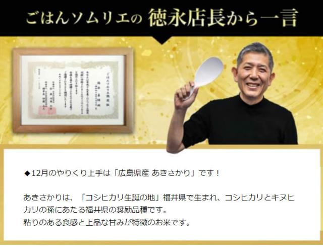 ◆12月のやりくり上手は「広島県産 あきさかり」です! あきさかりは、「コシヒカリ生誕の地」福井県で生まれ、コシヒカリとキヌヒカリの孫にあたる福井県の奨励品種です。 粘りのある食感と上品な甘みが特徴のお米です。 | |