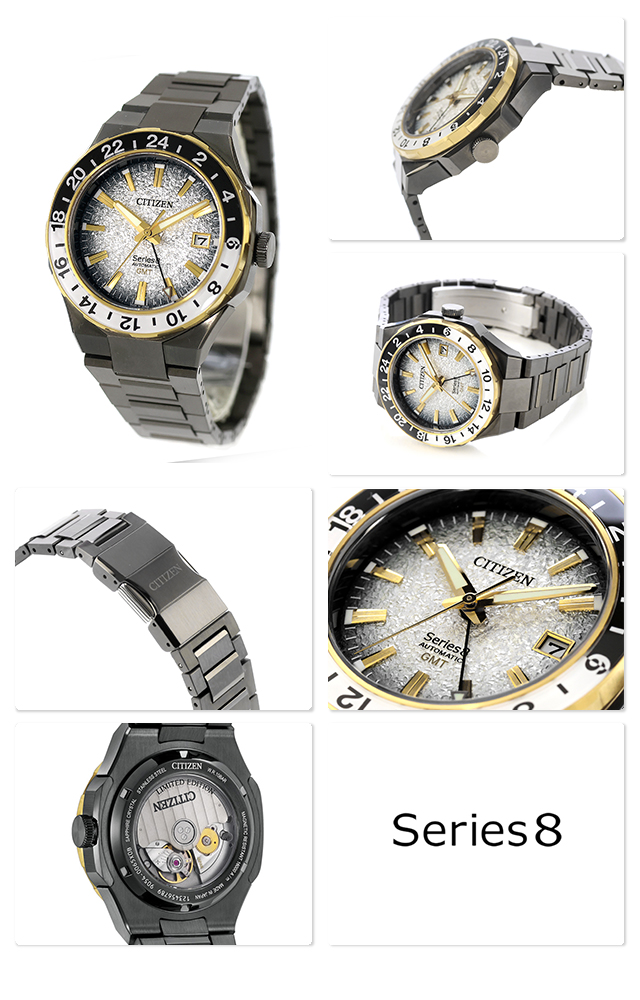 正規品 7年保証キャンペーン 送料無料 シチズン シリーズ8 数量限定 耐磁2種 日本製 メンズ 腕時計 NB6035-55H CITIZEN Series 8 880 Mechanical Limited アナログ グレーグラデーション ダークグレー 黒 ◆機能と実用性を兼ね備えたモダンデザインの機械式時計ブランド「Series 8(シリーズエイト)」。GMT機能を搭載した「880 Mechanical」から限定モデルが登場。雪降る夜の静謐な闇と都市の灯りを表現した、美しくラグジュアリーなデザインです。GMT機能付きムーブメントCal.9054を搭載。グレーめっきをベースに、アクセントカラーとしてホワイトとゴールドを使い、都市の灯りに照らされた雪の夜を表現しています。文字板は、ホワイトからブラックへのグラデーションで仕上げたオリジナルパターンを採用。アスファルトを覆う降り積もる雪が、都市の灯りに照らされている様子をイメージしています。ベゼル、インデックス、針に、夜の都市の灯りを想起させるゴールドをあしらい、特別感をきわだたせています。 発売日:2025年10月発売 機械式腕時計