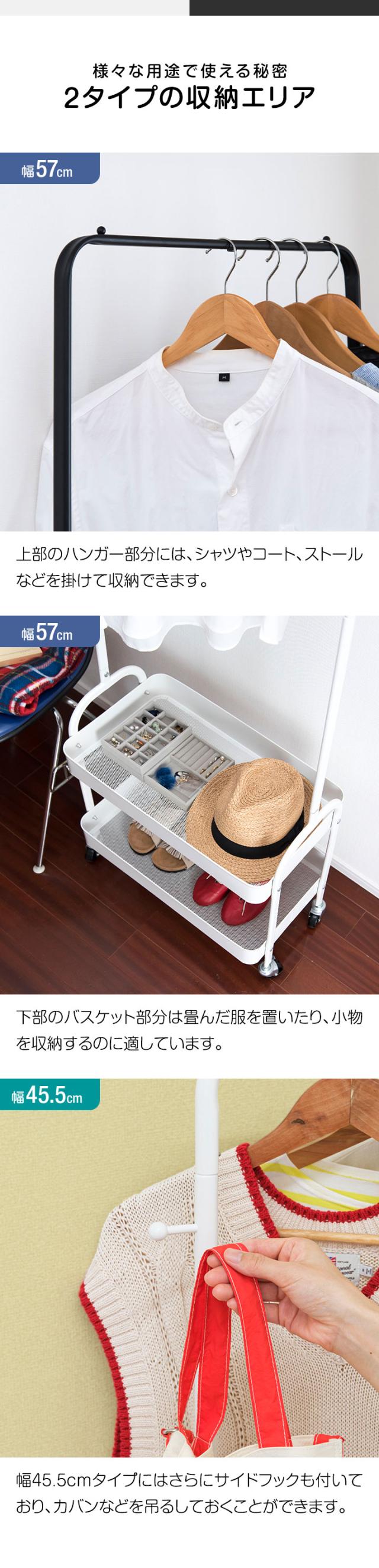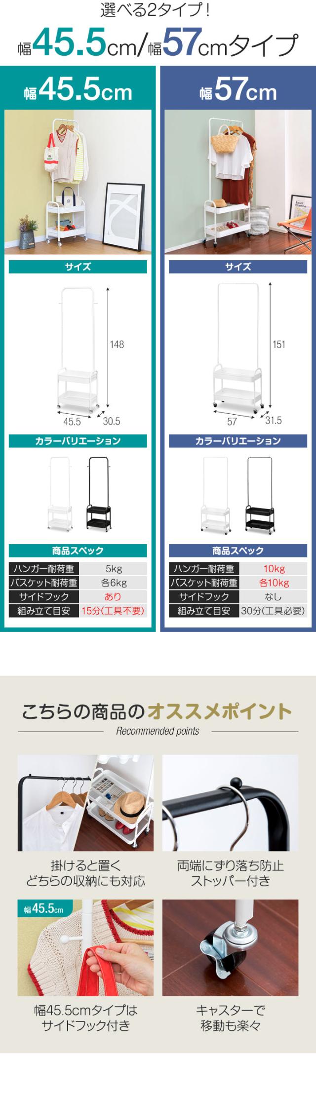 ハンガーラック スリム 2段 棚付き キャスター付き コートハンガー ワゴン カゴ付き 省スペース 衣類収納 サイドフック 幅45.5cm 高さ148cm 送料無料