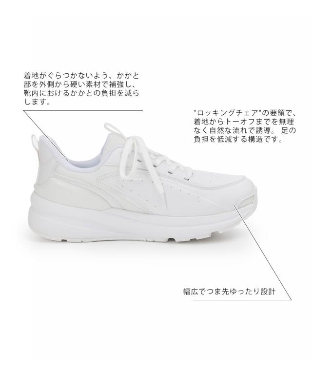足の親指分に余裕を持たせ、幅広でゆったりした設計。 フットケア向けシューズとして足に負担の少ないつくりです。