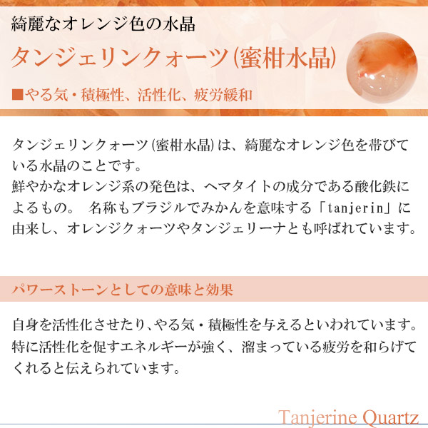 タンジェリンクォーツ(蜜柑水晶)は自身を活性化させたり、やる気・積極性を与えるといわれています。