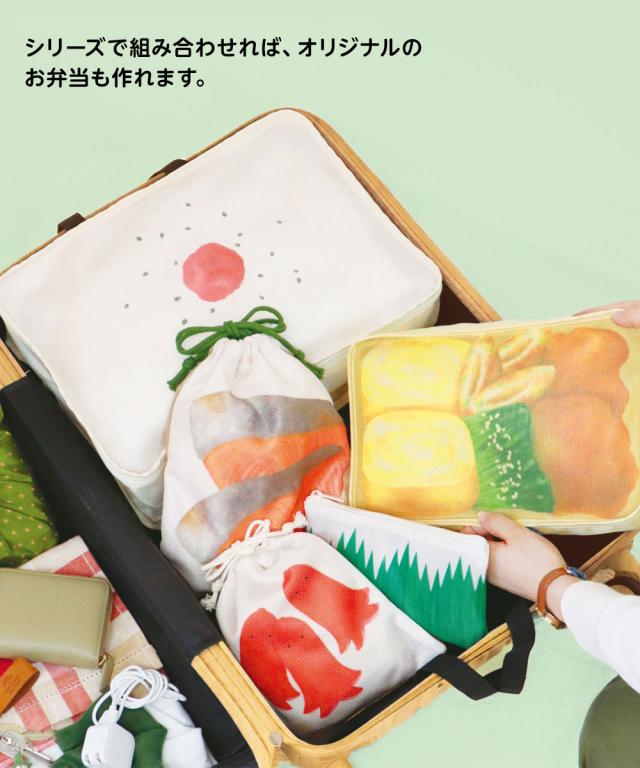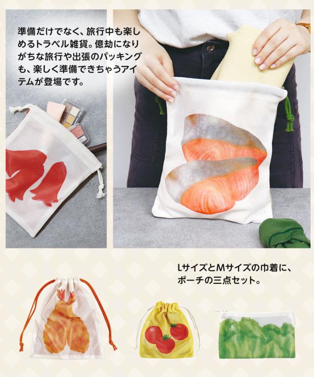巾着袋 3点セット トラベルポーチ セット かわいい 旅行 トラベル パッキング 収納 便利 整理整頓 仕分け 軽量 レディース メンズ 出張 修学旅行 入院 旅行用 小物 雑貨 ポーチ Mサイズ Lサイズ シャケ&タコさん エビフライ&トマト 旅するお弁当 巾着・ポーチ3点セット