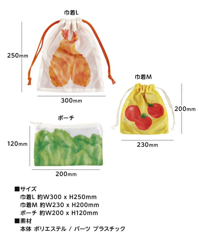 巾着L 約W300 x H250mm / 巾着M 約W230 x H200mm / ポーチ 約W200 x H120mm