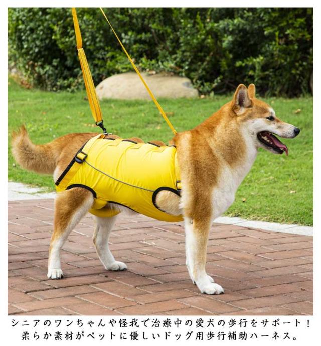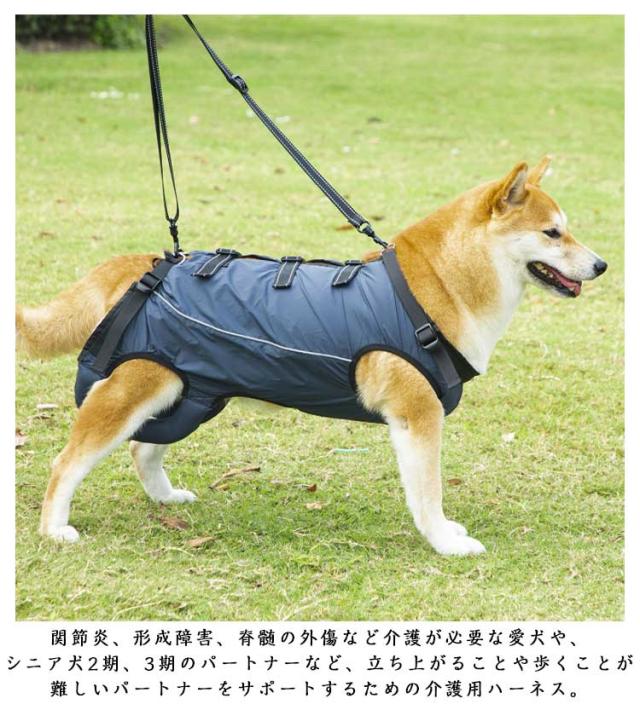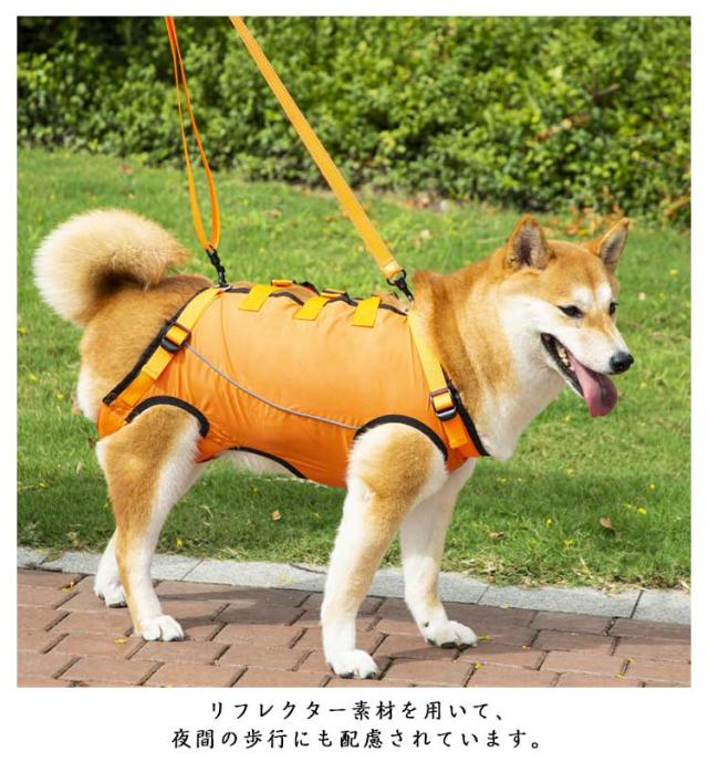 | 全身サポート 歩行補助ハーネス 老犬の介護に!脚の怪我に!犬用介護ハーネス 簡単に使える 関節炎、形成障害、脊髄の外傷など介護が必要な愛犬や、シニア犬2期、3期のパートナーなど、立ち上がることや歩くことが難しいパートナーをサポートするための介護用ハーネス。 シニアのワンちゃんや怪我で治療中の愛犬の歩行をサポート!柔らか素材がペットに優しいドッグ用歩行補助ハーネス。 裏地のメッシュ素材は、蒸れ等を防止し、ワンちゃんへのアタリもソフトにしてくれます。また、後ろ足のソフトパットも、弱っているワンちゃんには優しい心遣いかと思います。 リフレクター素材を用いて、夜間の歩行にも配慮されています。 背中の3ヶ所のバックルをはめ込み、ハンドベルトを前後のDカンに留めたら、すぐにお散歩にGO! 高齢になって足腰の弱った愛犬や、足や関節に怪我を負ったり、ハンディキャップのあるワンちゃんの歩行をサポートするドッグ用ハーネス。飼い主さんとのお散歩をなにより楽しみにしているワンちゃんに最適。 | |
