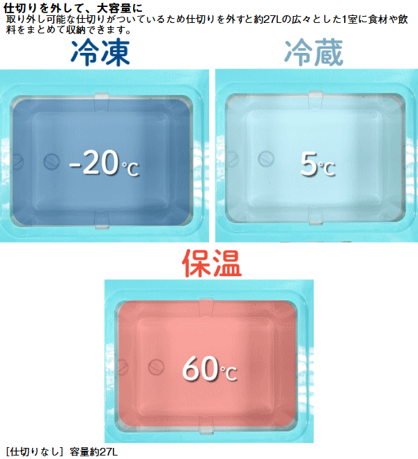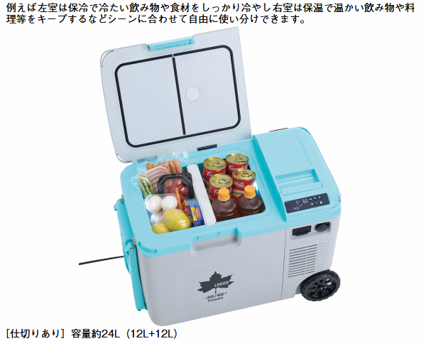 保冷も保温もこれ一台で同時に叶えるホイール付きポータブル温冷庫。左室は冷たい飲み物や食材をしっかり冷やし右室では温かい料理をキープ。仕切りを外せば広々とした単一の保冷庫又は保温庫としても使用可能。キャンプや長距離ドライブ等あらゆるシーンで活躍します。USBポートとシガーソケットポートを搭載しておりスマートフォンや外部機器の充電も可能。移動に便利なホイール付で快適さと機能性を兼ね備えた一台です。■目安能力[冷却]約-20℃[保温]約60℃■設定可能温度-20〜60℃■総重量約14.5kg■サイズ約幅61.5×奥行33.5×高44cm■内寸[仕切りなし]約幅32×奥行23×高35cm[左室・右室]約幅14.5×奥行23×深さ35cm■容量[仕切り]なし約27L/あり約24L(12L+12L)■電源AC100V/DC12V及び24V■定格電力80W■USB出力5V/3A(電源接続時のみ可能)■構成:本体、ACケーブル、ACアダプター、DCシガーソケットケーブル※本品は家電リサイクル法の対象商品です。設定温度とは冷却力の設定温度です。MAXで-20℃に設定できます。
