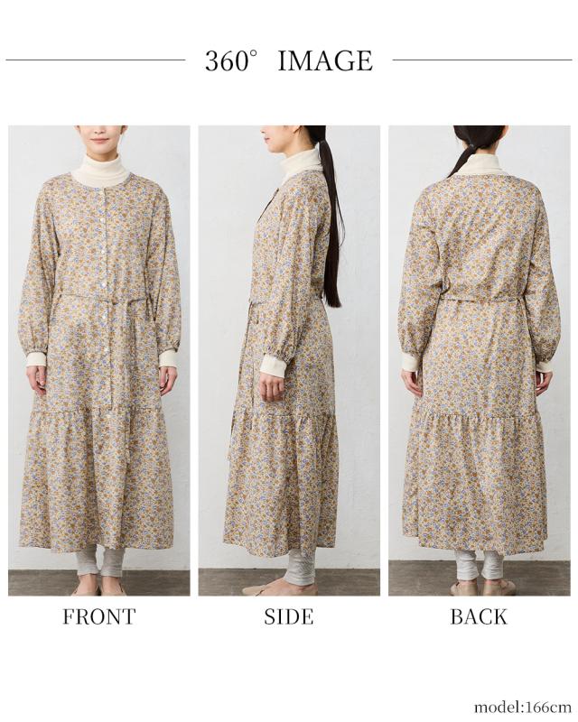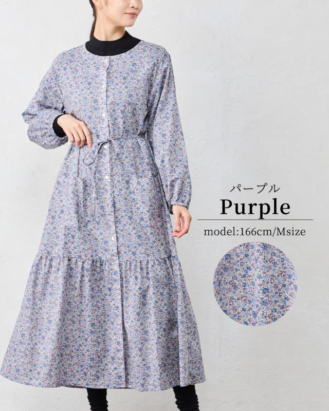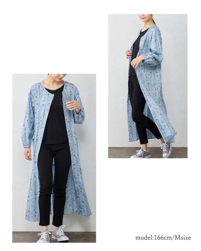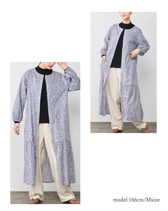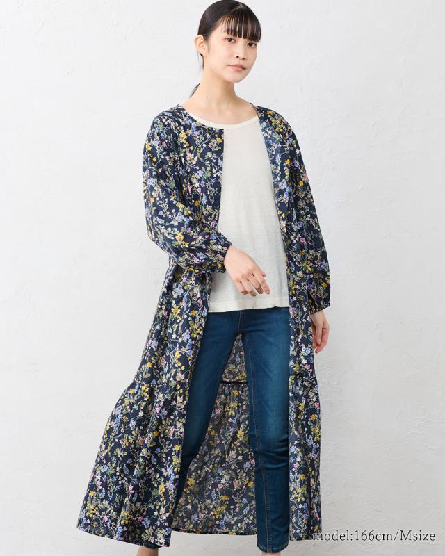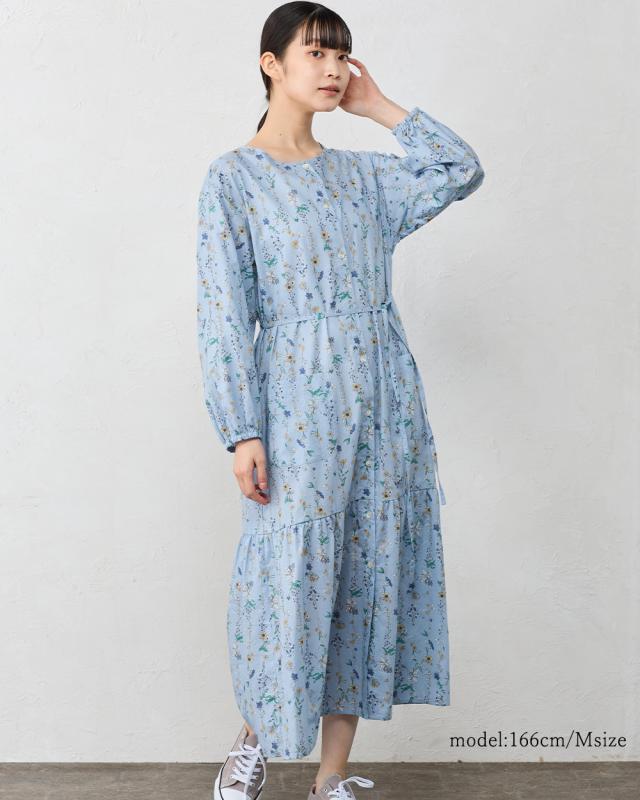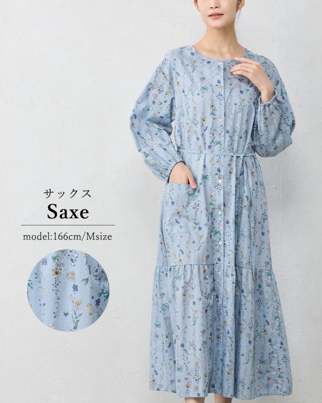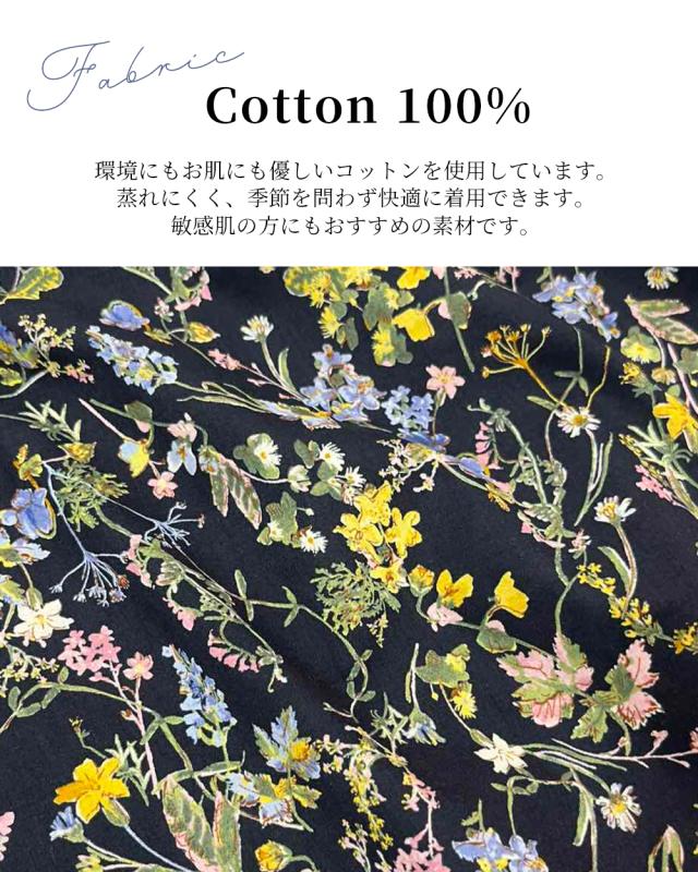 綿100%のやさしい肌ざわりと前開きデザインで、一枚でも羽織りでも楽しめる花柄ワンピース。
