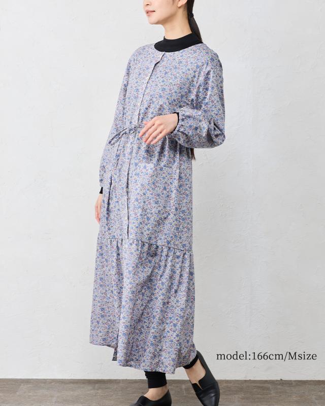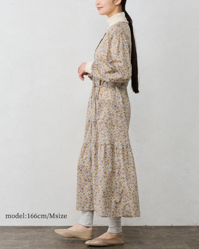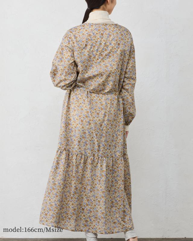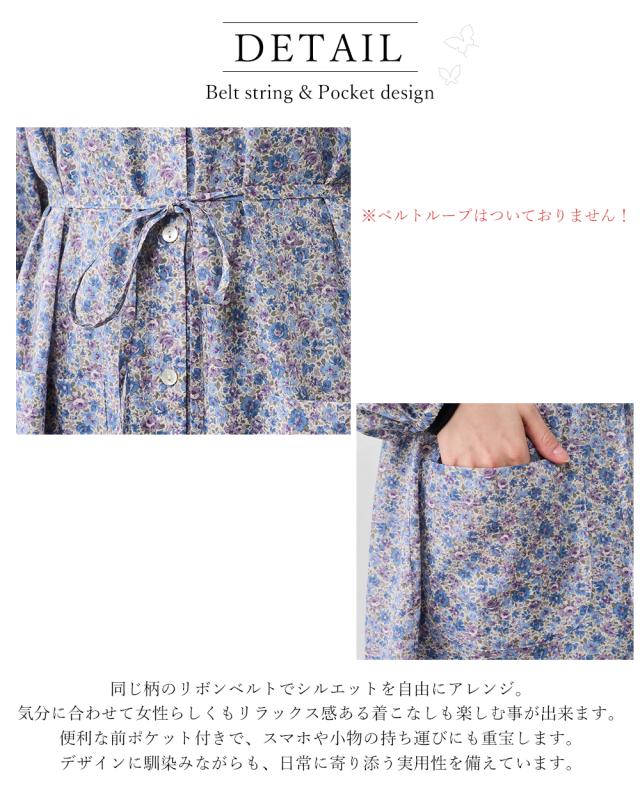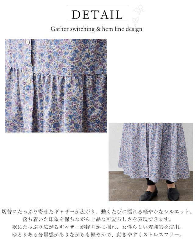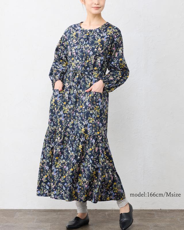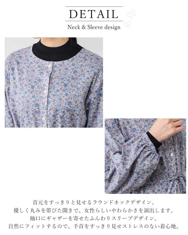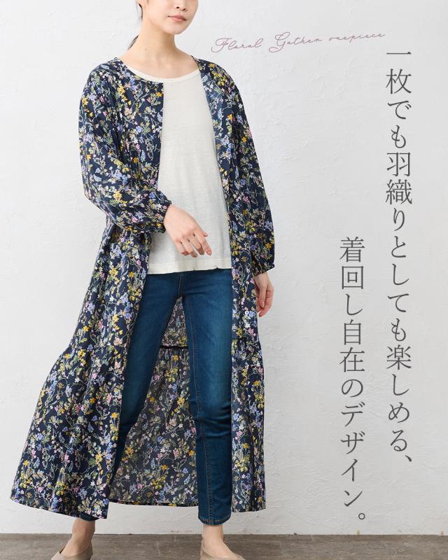 【日本製】 綿100 花柄ギャザーワンピース 長袖 ラウンドネック ポケットロング丈 レディース 花柄 綿 コットン オーバーサイズ 快適 羽織 重ね着 レイヤード ウエストリボン ギャザー切替 カジュアル フェミニン