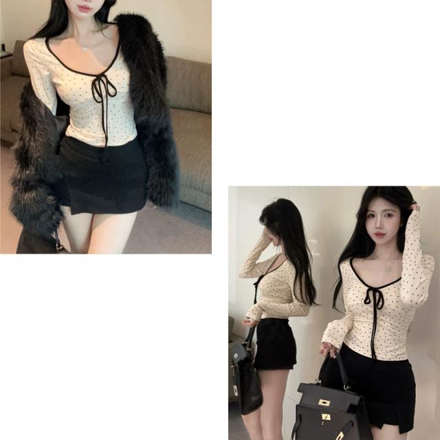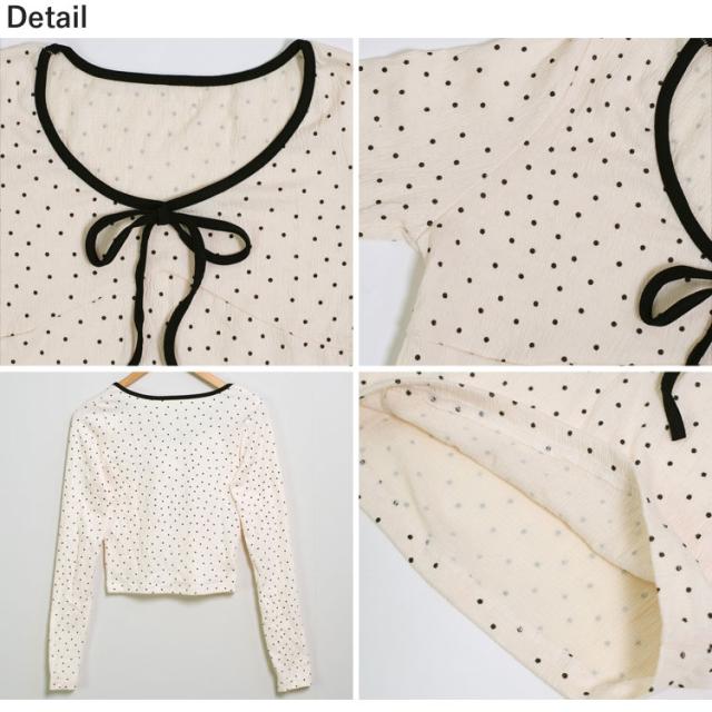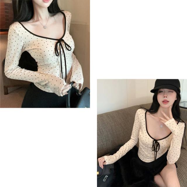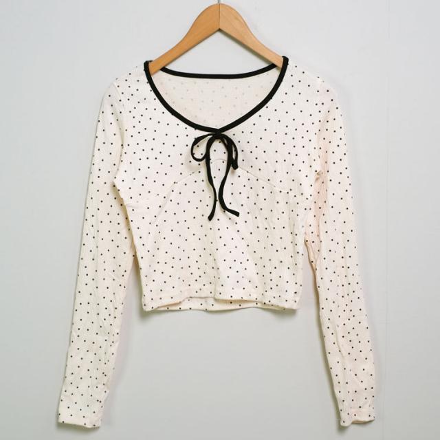 全品送料無料一部除く ドット柄 フロントリボン スリムトップス ma 【即納】ロングTシャツ ロンT 長袖 Tシャツ Uネック ドット ポルカドット バイカラー エンジェルコア ウィッシュコア レディース 韓国 Y2Kファッション 韓国ストリート 流行り トレンド かわいい