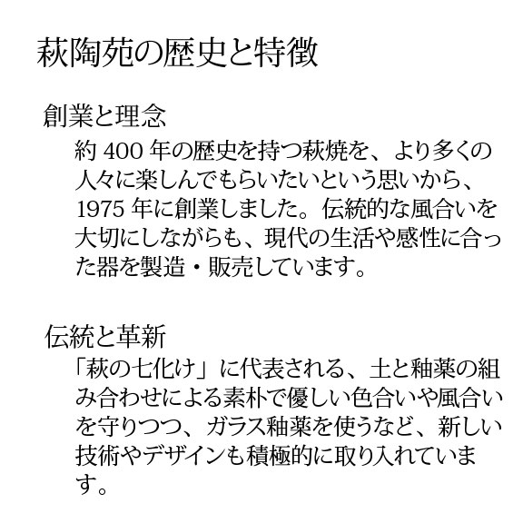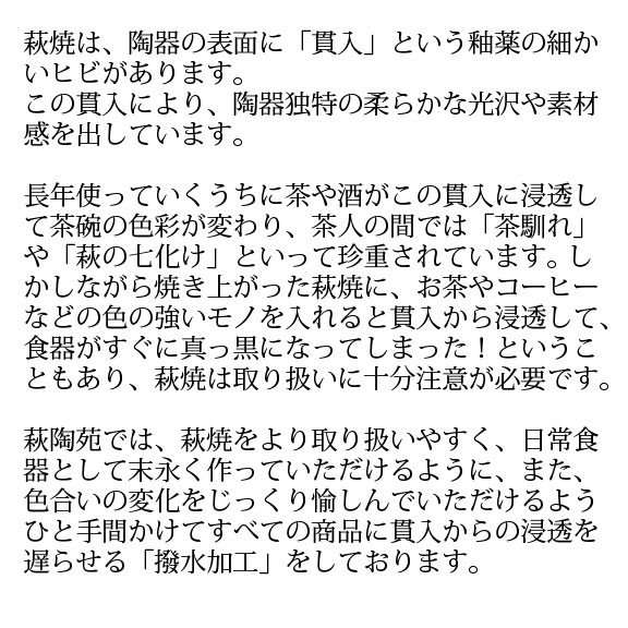※萩焼の色合いは、土と釉薬が溶け合って生まれます。ひとつとして同じ色合いのものはございません。焼き上がりの商品を検品し、萩陶苑の基準にて許容できる色合い・風合いの違いは良品とさせていただいております。萩焼の特性をご理解いただき、ご注文くださいますようお願いいたします。