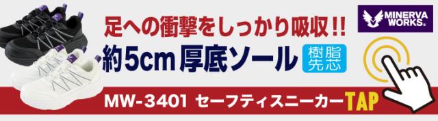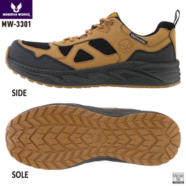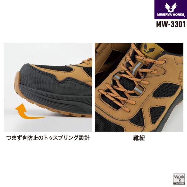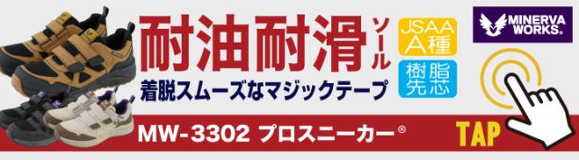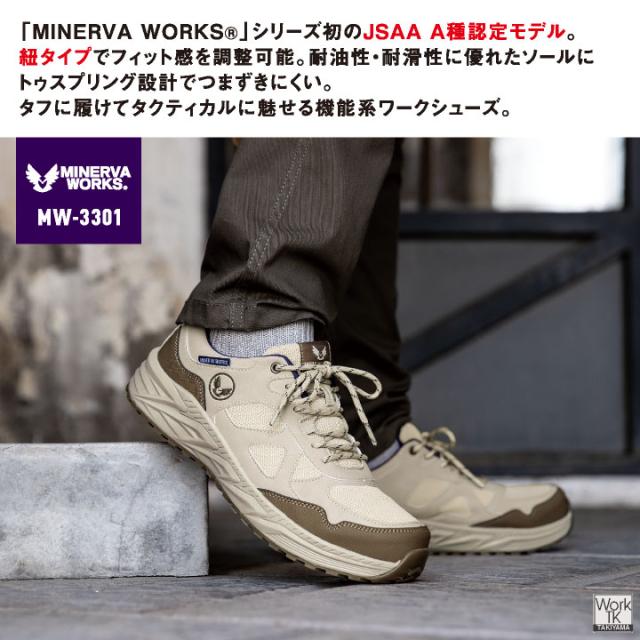 MINERVA WORKS MW-3301 プロスニーカー(R) シリーズ初のJSAA A種認定モデル! 紐タイプでフィット感を調整。可能 耐油・耐滑ソールで滑りにくく、つまずきを防ぐ。