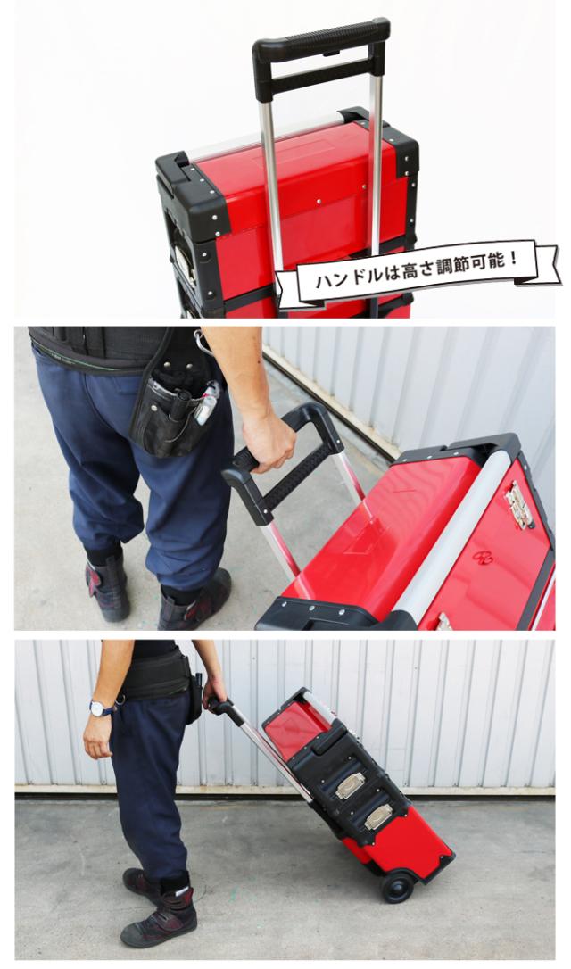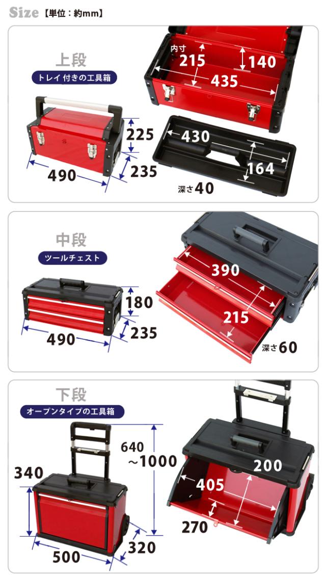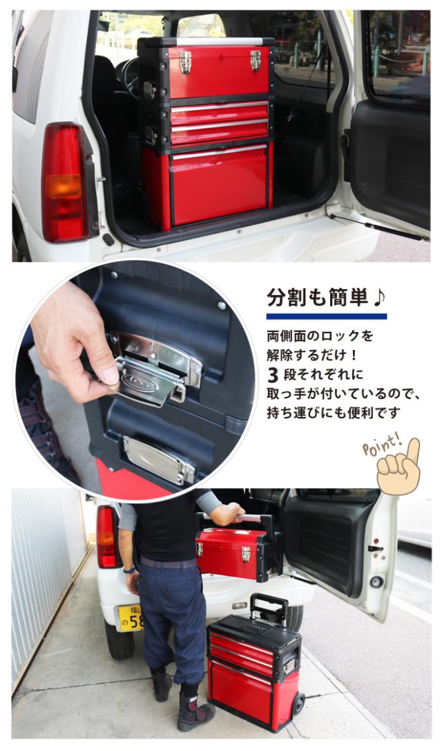 キャリー付きで持ち運び便利!3段ツールボックス ●工具から小物類まで幅広く収納できる3段のツールボックスです ●側面のロックを解除すれば、上段・中段・下段を分割して使用できます ●上段は大型アルミハンドル付き、小物類を整理できるトレイ(中皿)付きの工具箱に なっています ●中段は2段のツールチェストで、ベアリング入りの引き出しは動きもスムーズです ●下段はオープンタイプの収納になっているので、電動工具などの大きな物も入ります ●3段それぞれに取っ手が付いているので、持ち運びにも便利です ●キャスター付きなので、キャリーバッグのように移動ができます ●南京錠やワイヤーロックを取り付ける事が可能です (※南京錠・ワイヤーロックは付属しません) |