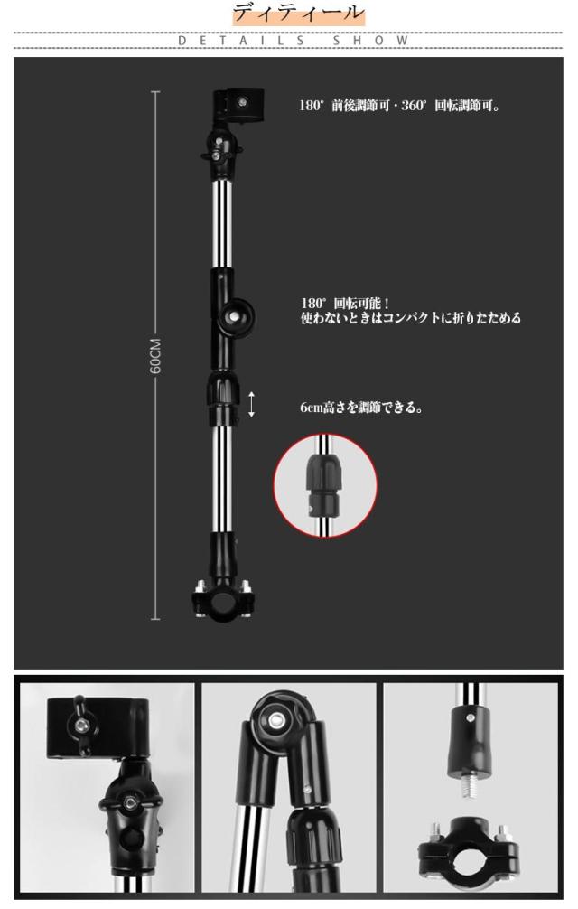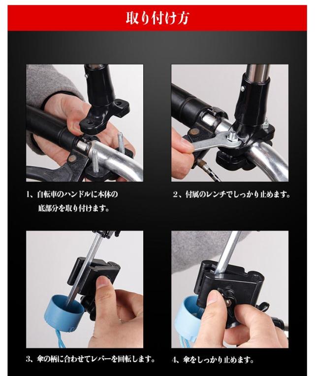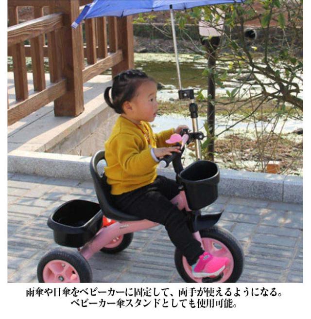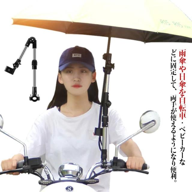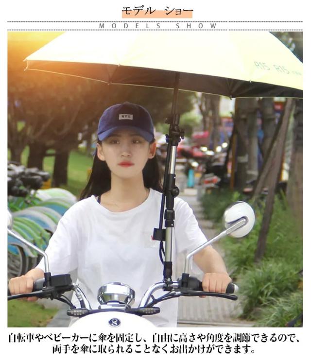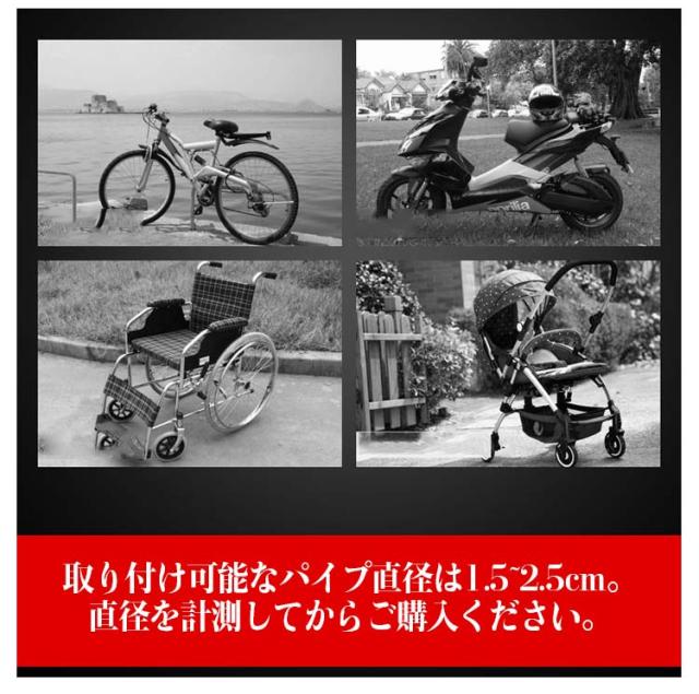 | 雨傘や日傘を自転車・ベビーカーなどに固定して、両手が使えるようになり便利。 自転車やベビーカーに傘を固定し、自由に高さや角度を調節できるので、両手を傘に取られることなくお出かけができます。 雨傘や日傘をベビーカーに固定して、両手が使えるようになる。ベビーカー傘スタンドとしても使用可能。 梅雨はもちろん、日差しが強い時期にも大活躍! 取り付け可能なパイプ直径は1.5~2.5cm。直径を計測してからご購入ください。 | |