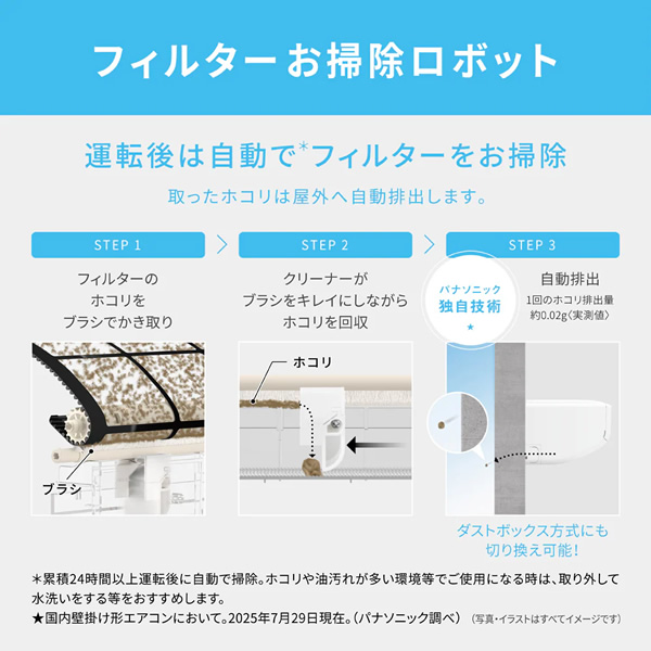 運転後は自動でフィルターをお掃除。取ったホコリは屋外へ自動排出します。