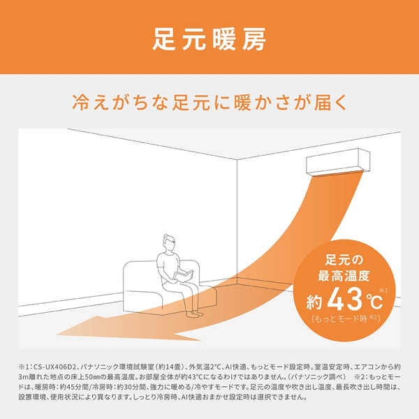 お部屋の上部にたまった暖気を有効活用。足元気流に加え、上部の暖気を撹拌。