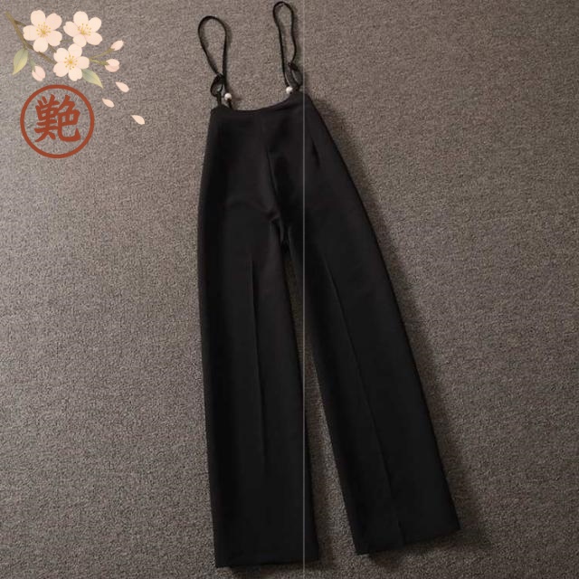 細いストラップでさりげないアクセントを施したサロペット風ワイドパンツ。