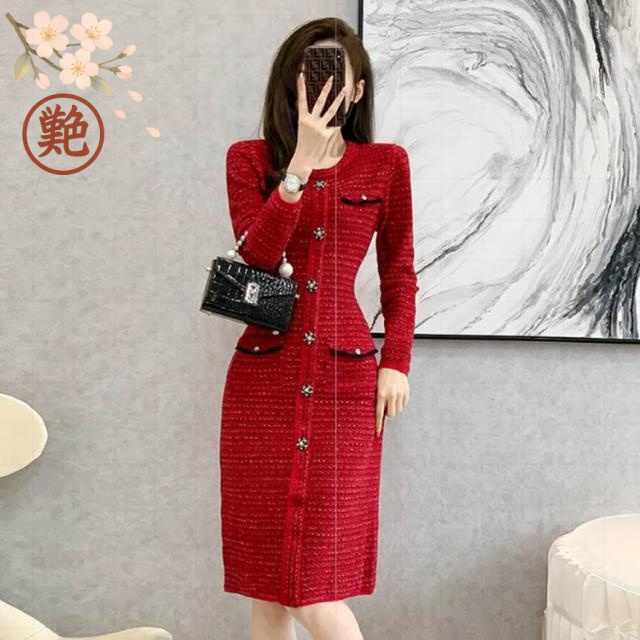 おしゃれ フェミニン お洒落 フラワーボタン フォーマル 長袖 フラワーボタン ニットワンピース ワンピース 春 可愛い 大人 ニット 春 ロングワンピース 春服 大人 上品 きれいめ ツイード風