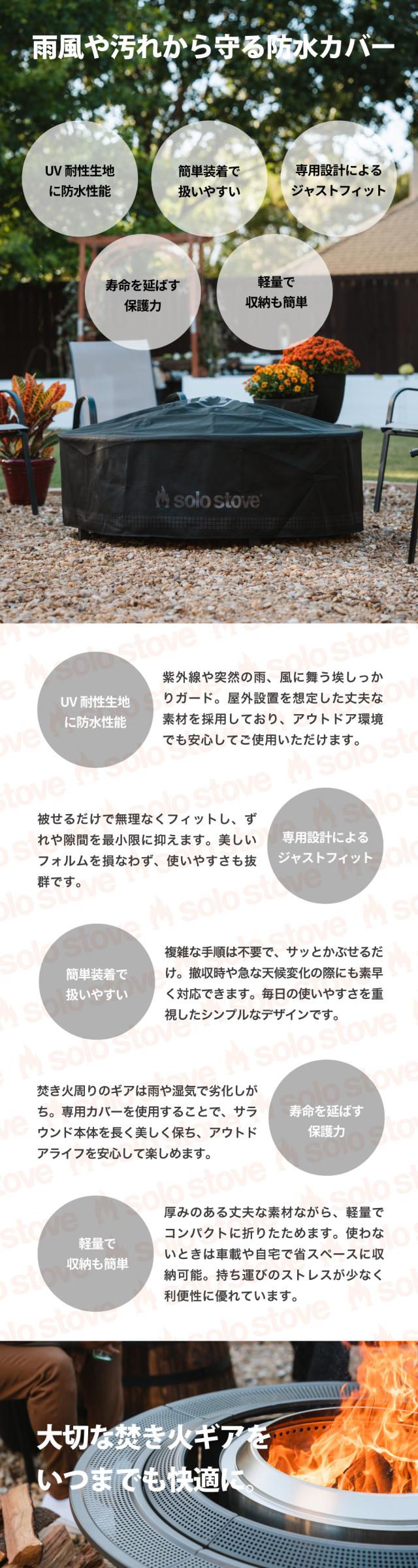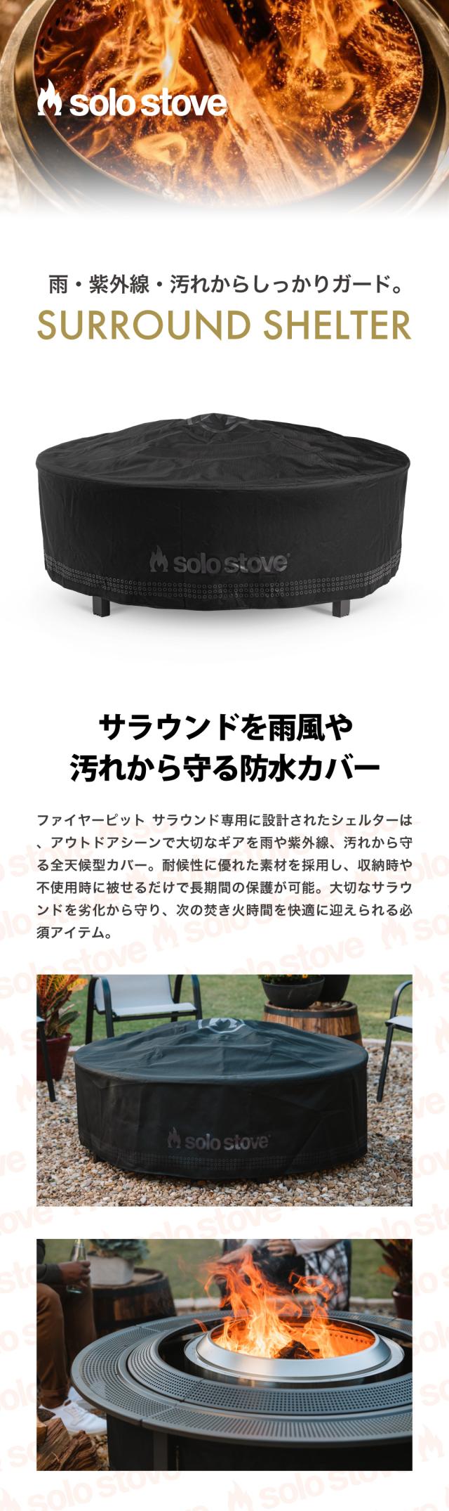 ファイヤーピット サラウンド シェルターは、ソロストーブの「ファイヤーピット サラウンド (スモール、ラージの2種)」 に対応した専用の防水カバーです。サラウンド自体を撤収したりする必要なく、お庭やテラスなど、使用したい場所でそのままカバーを被せるだけで雨や雪、埃などからサラウンドを守り、汚れや劣化などを防ぎます。 サラウンド内には、ファイヤーピットを入れたままでも問題なくカバーをかけることができます。
