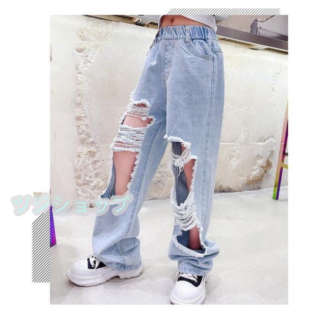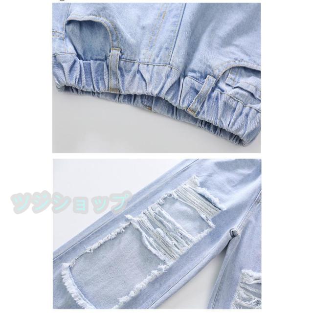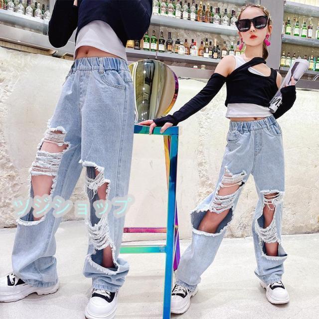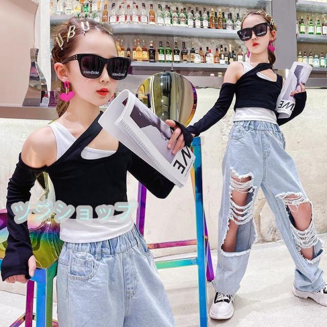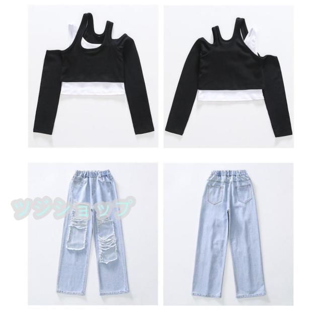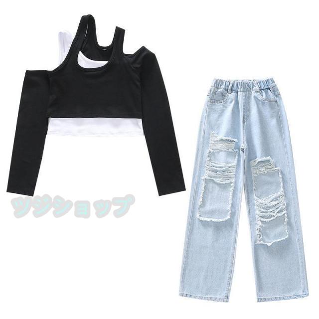 キッズ ダンス 衣装 セットアップ デニムパンツ ダメージパンツ へそ出し ガールズ 女の子 tシャッツ ス ヒップホップ 発表会 韓国