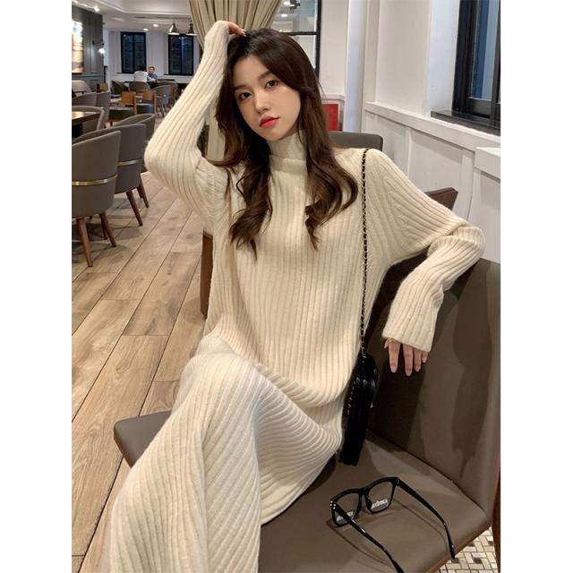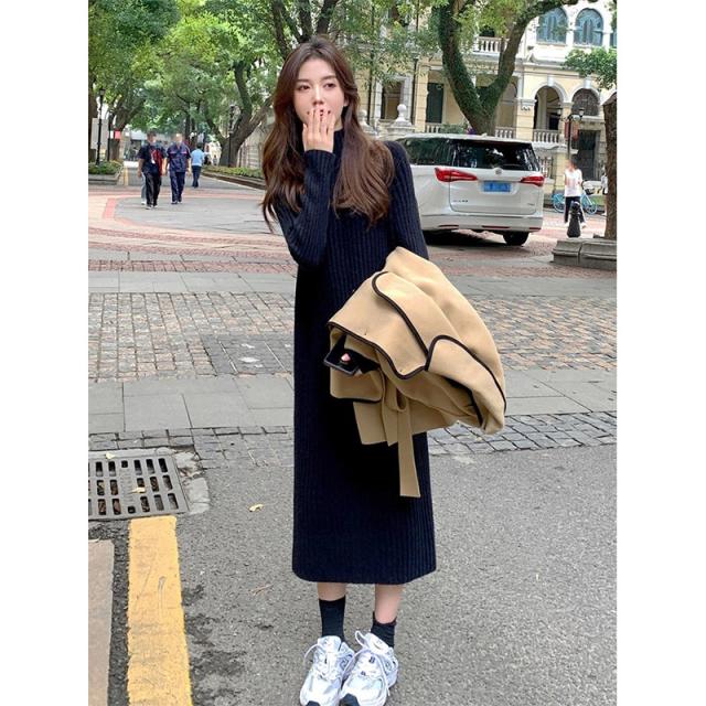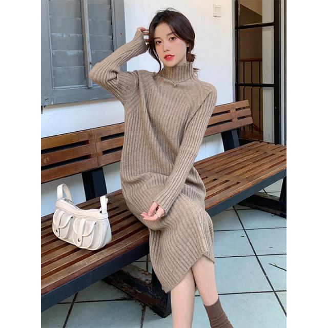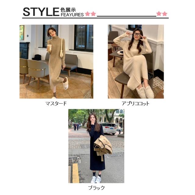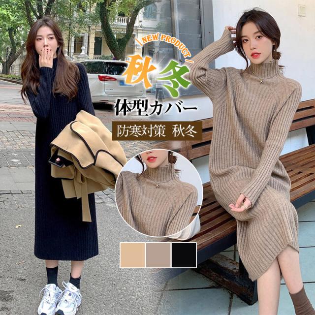2点300円OFF! ワンピース レディース 冬 秋 ニット セーター パープル ハイネック リプ 長袖 ニット 無地 着やせ 秋冬 ロング シンプル 体型カバー