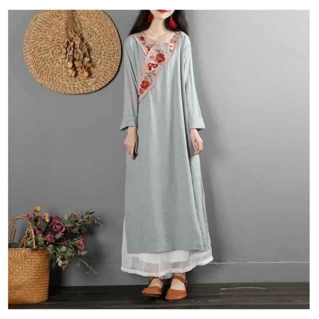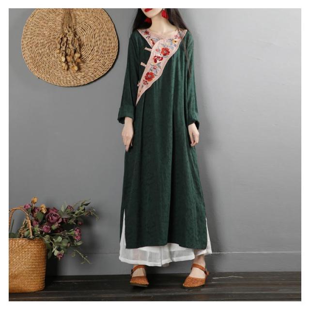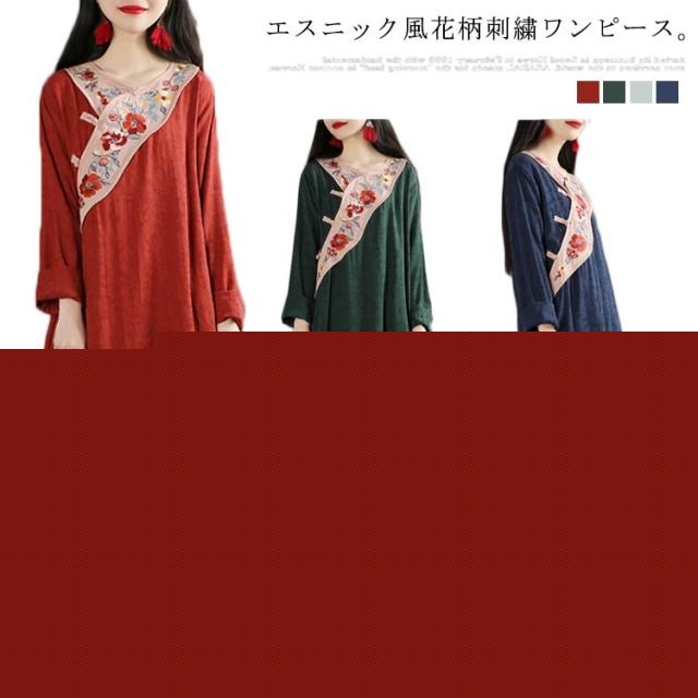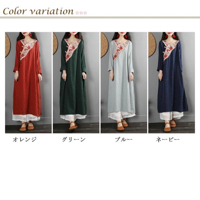 ワンピース マキシワンピース 長袖 花柄刺繍ワンピース マキシ丈 長袖ワンピース マキシ丈ワンピース 綿麻 花柄 刺繍 Vネック 春 秋